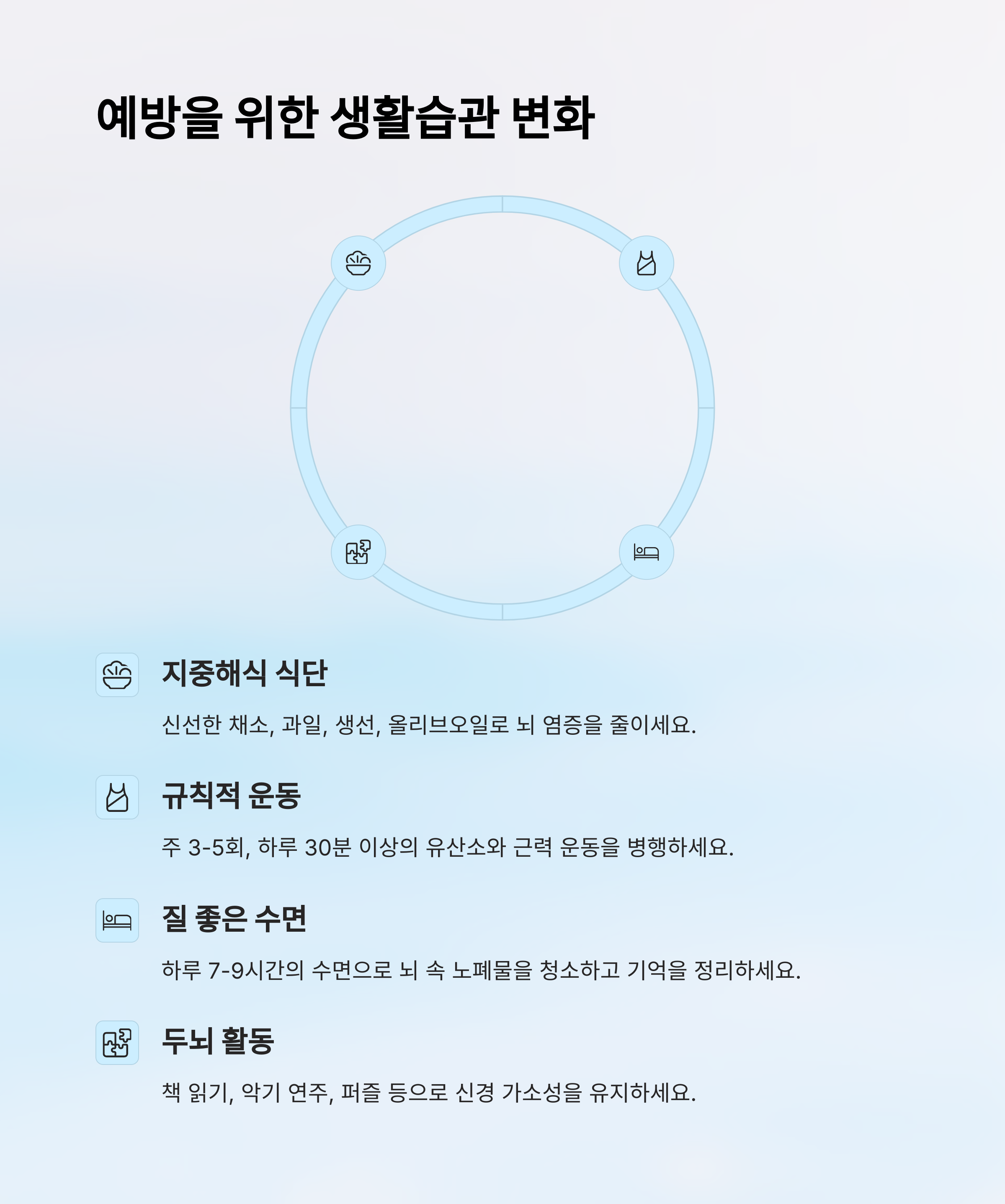 알츠하이머병은 오랜 시간에 걸쳐 뇌에 서서히 영향을 주는 질환이에요. 따라서 하루아침에 예방하는 건 어렵지만, 생활습관을 바꾸면 발병 위험을 현저히 줄일 수 있어요. 운동, 식단, 수면, 정신 건강까지 균형 잡힌 루틴을 만들면 뇌를 오랫동안 건강하게 유지할 수 있답니다.