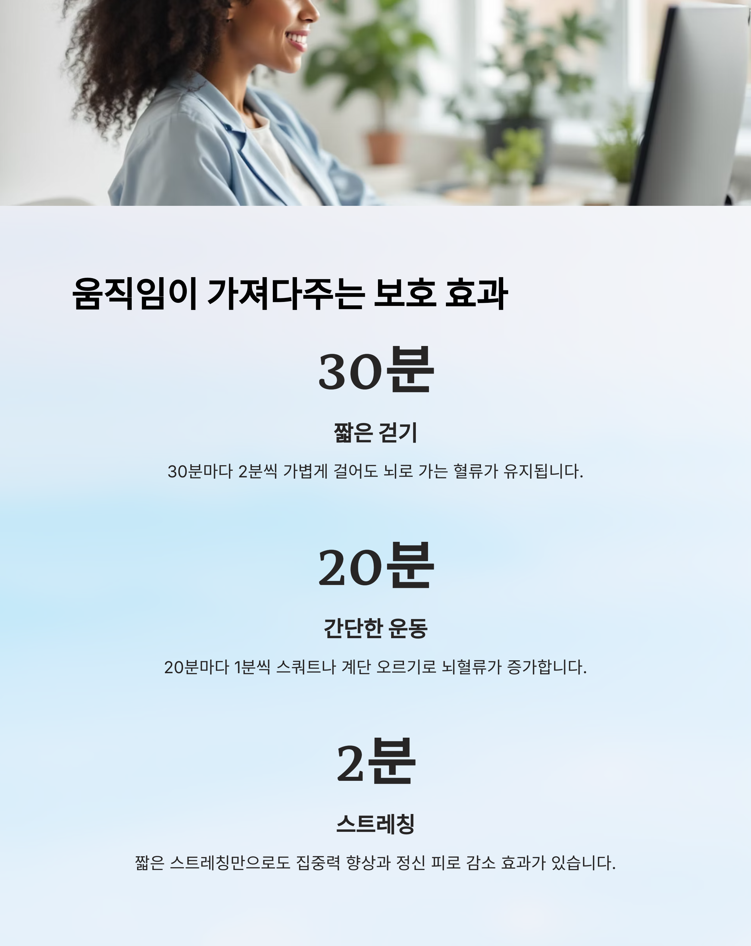 | 30분마다 | 2분 걷기 | 혈류 유지 | 기억력 보호 |