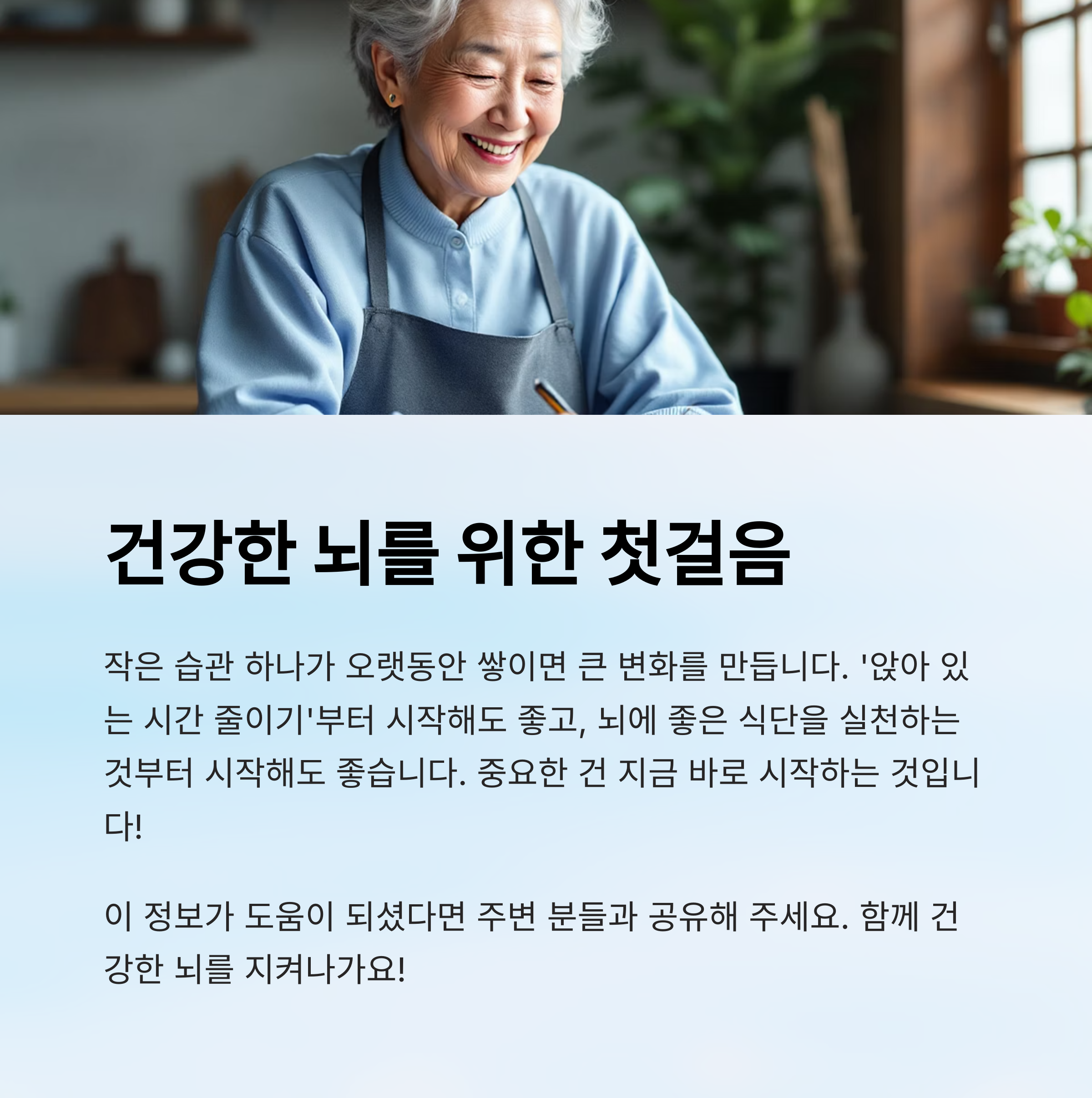 작은 습관 하나가 오랫동안 쌓이면, 결국 큰 변화를 만들어요. ‘앉아 있는 시간 줄이기’부터 시작해도 좋고, 뇌에 좋은 식단을 실천하는 것부터 시작해도 좋아요. 중요한 건, **지금 시작하는 것**이에요!