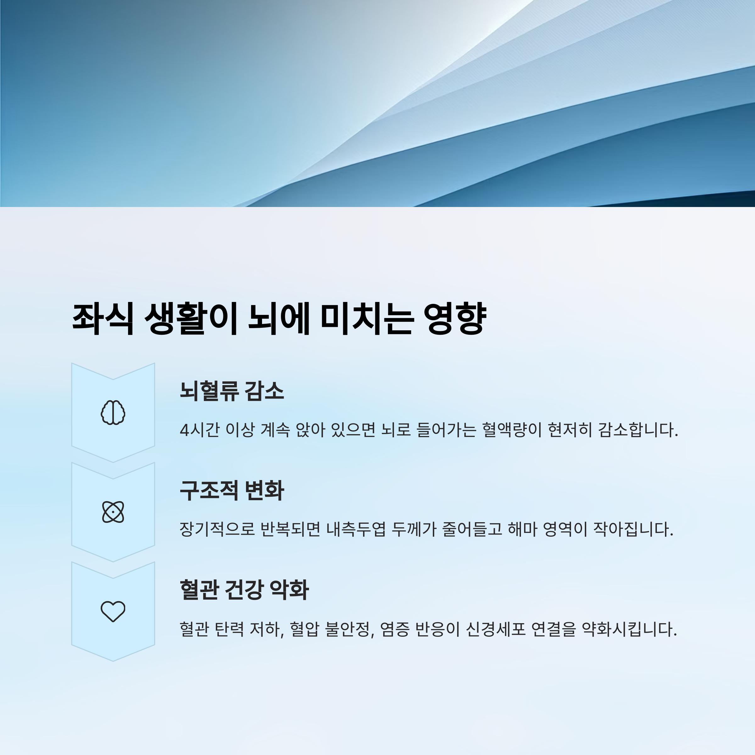 | 좌식 시간 | 혈류 변화 | 뇌 영역 영향 | 인지 기능 |