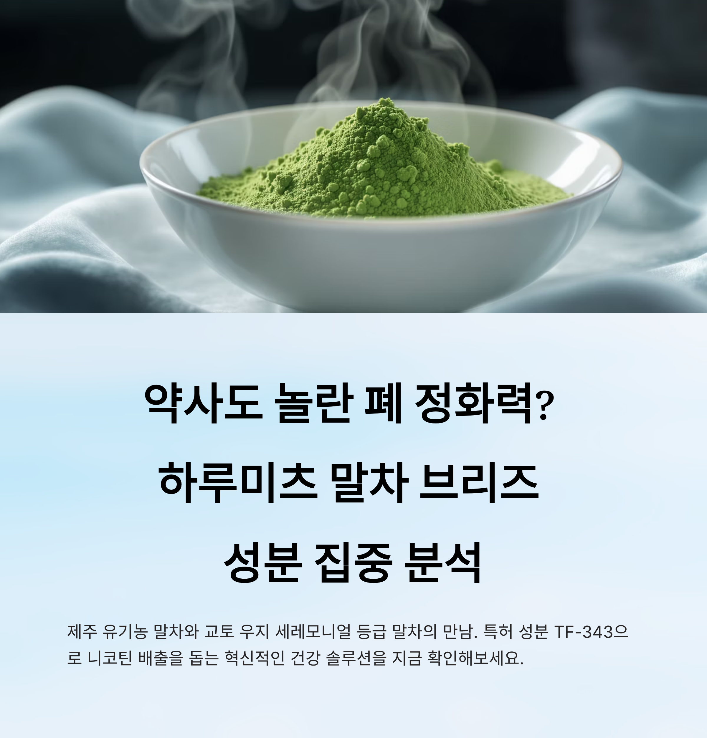 하루미츠 말차 브리즈는 제주 유기농 말차와 일본 교토 우지 지역의 세레모니얼 등급 말차를 결합해 만들어진 건강 보조제예요. 단순한 말차 음료가 아니라, 특허 성분 TF-343과 여러 프리미엄 원료가 더해져 흡연자와 현대인의 니코틴 배출에 도움을 주는 솔루션으로 주목받고 있답니다.