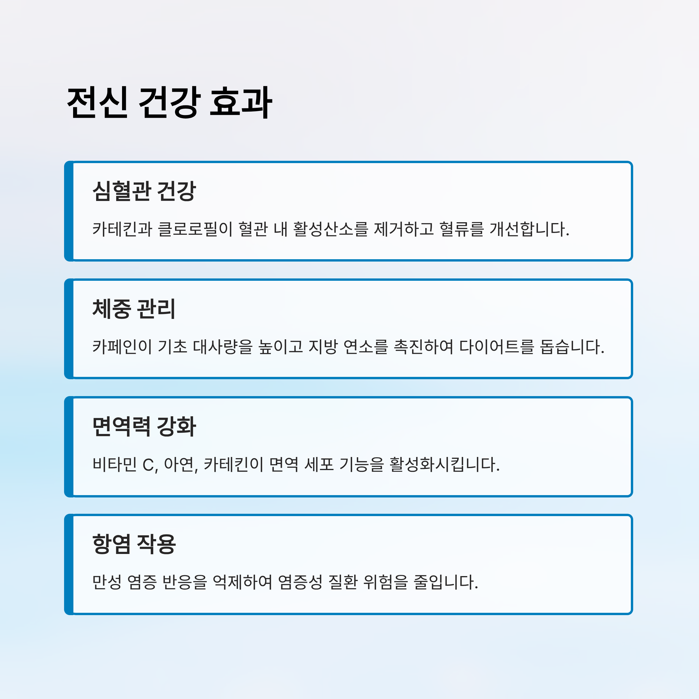 | 심혈관 건강 | 카테킨, 클로로필 | 혈류 개선, 혈압 조절 |