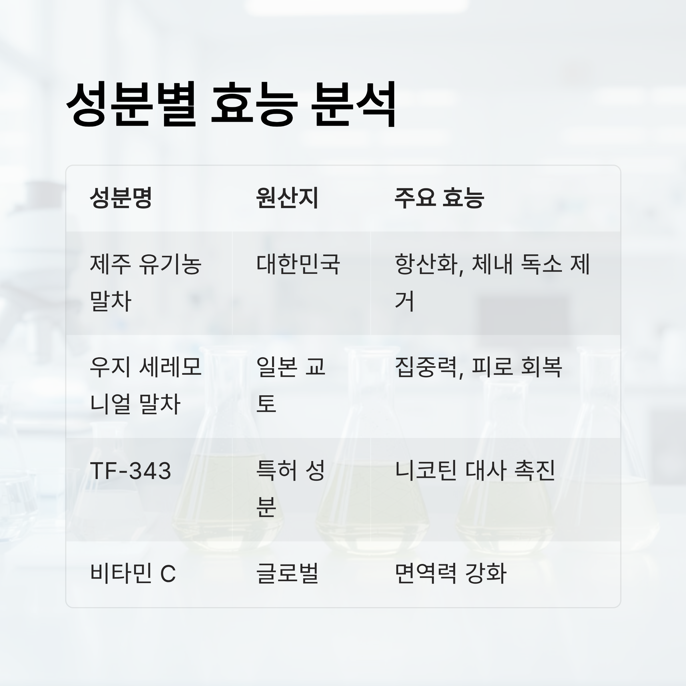 하루미츠 말차 브리즈의 가장 큰 특징은 성분 구성이에요. 첫 번째는 제주 유기농 말차로, 강력한 항산화 효과를 지니고 있어요. 두 번째는 교토 우지의 세레모니얼 등급 말차로, 카페인과 테아닌의 균형이 뛰어나 피로 회복과 정신 안정에 도움을 준답니다. 세 번째는 특허 성분 TF-343으로, 체내 니코틴 대사를 촉진해 빠른 배출을 돕는다는 점에서 이 제품의 핵심이라 할 수 있어요.