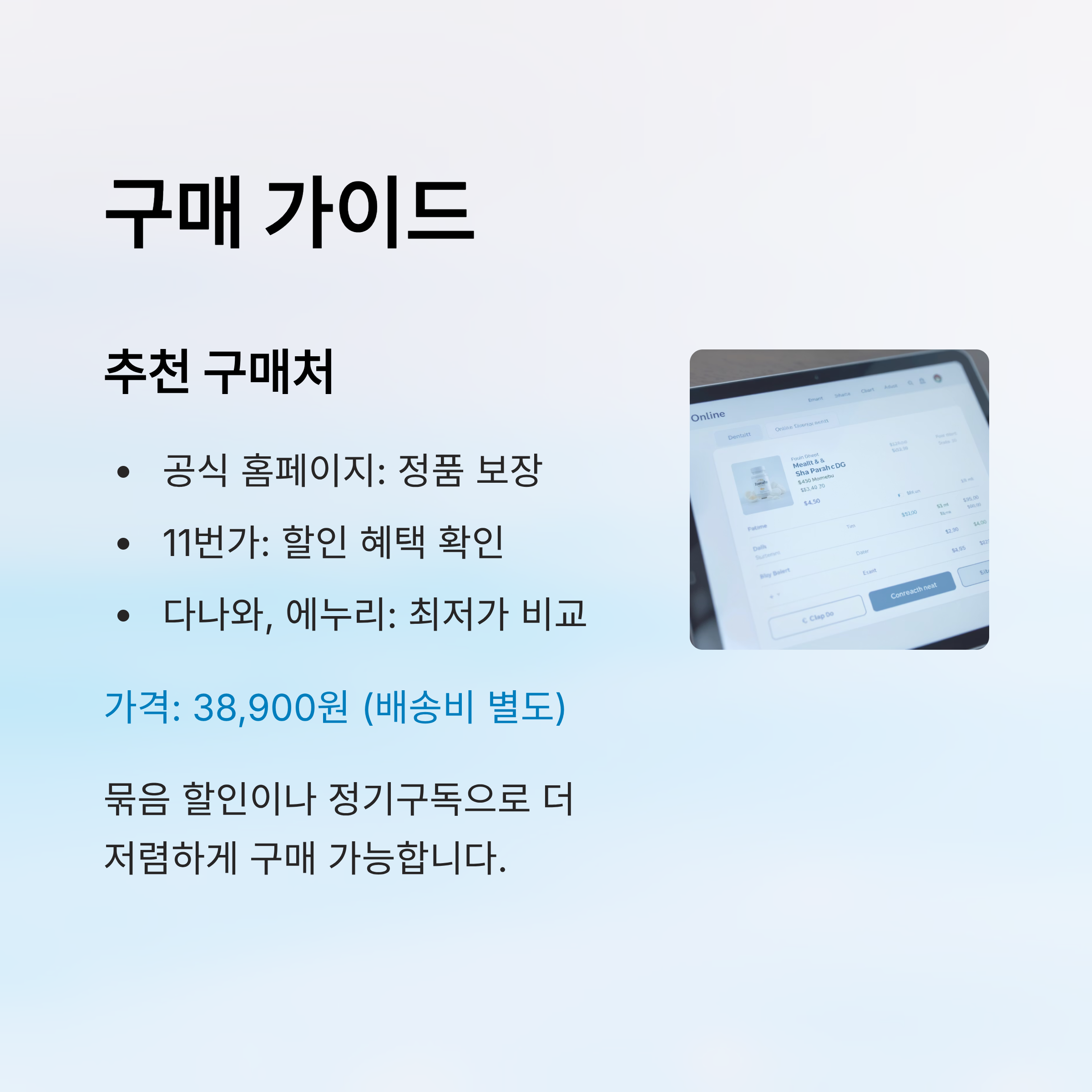 가격대는 38,900원으로 보급형 건강기능식품보다는 조금 높은 편이지만, 원료의 질과 기능성을 고려하면 충분히 납득할 만하다는 평가가 많아요. 여기에 정품 보장을 받기 위해서는 공식몰에서 구입하는 것이 가장 안전해요. 🌱