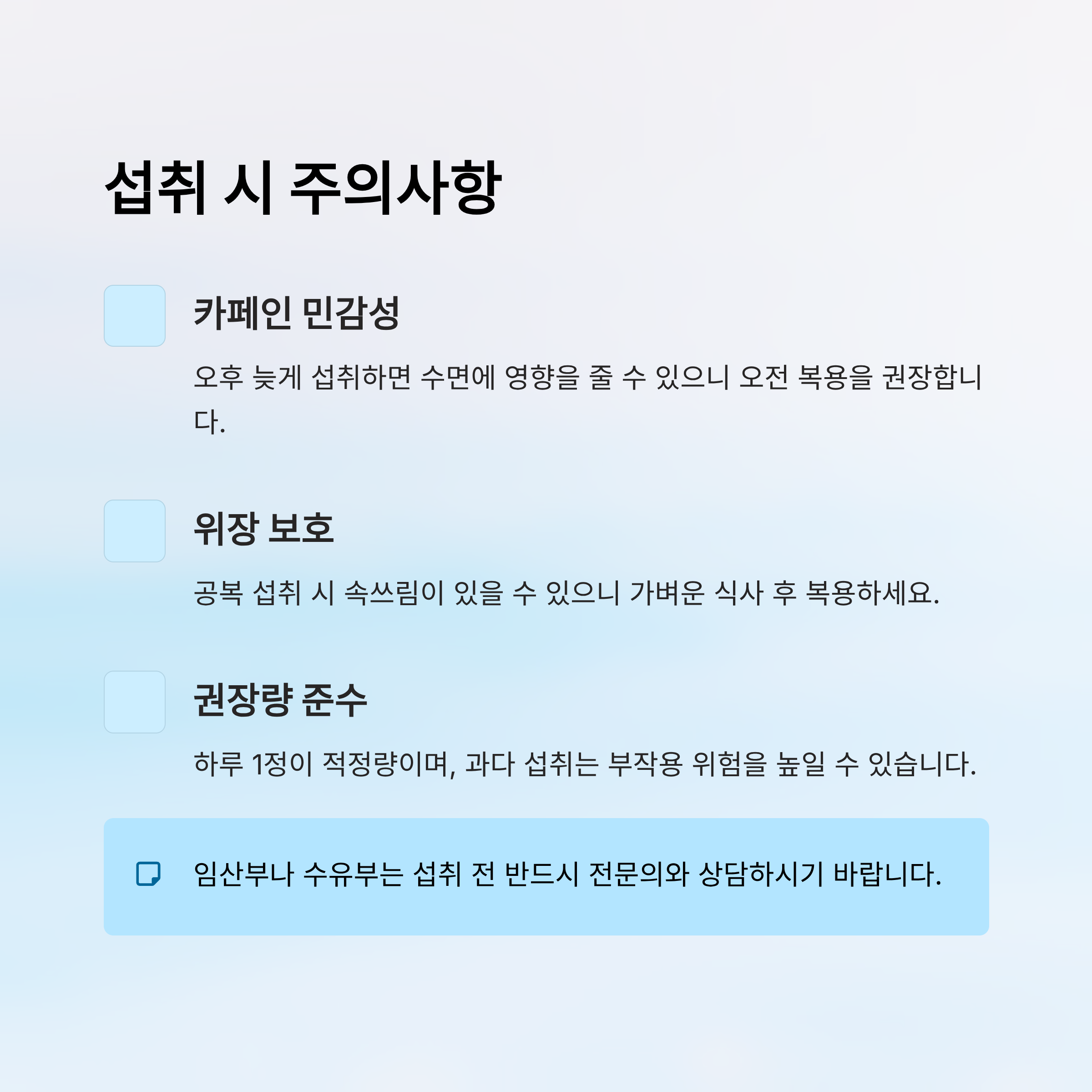 A4. 카페인이 포함돼 있어 임산부나 수유부는 섭취 전 반드시 전문의와 상담하는 것이 안전해요.