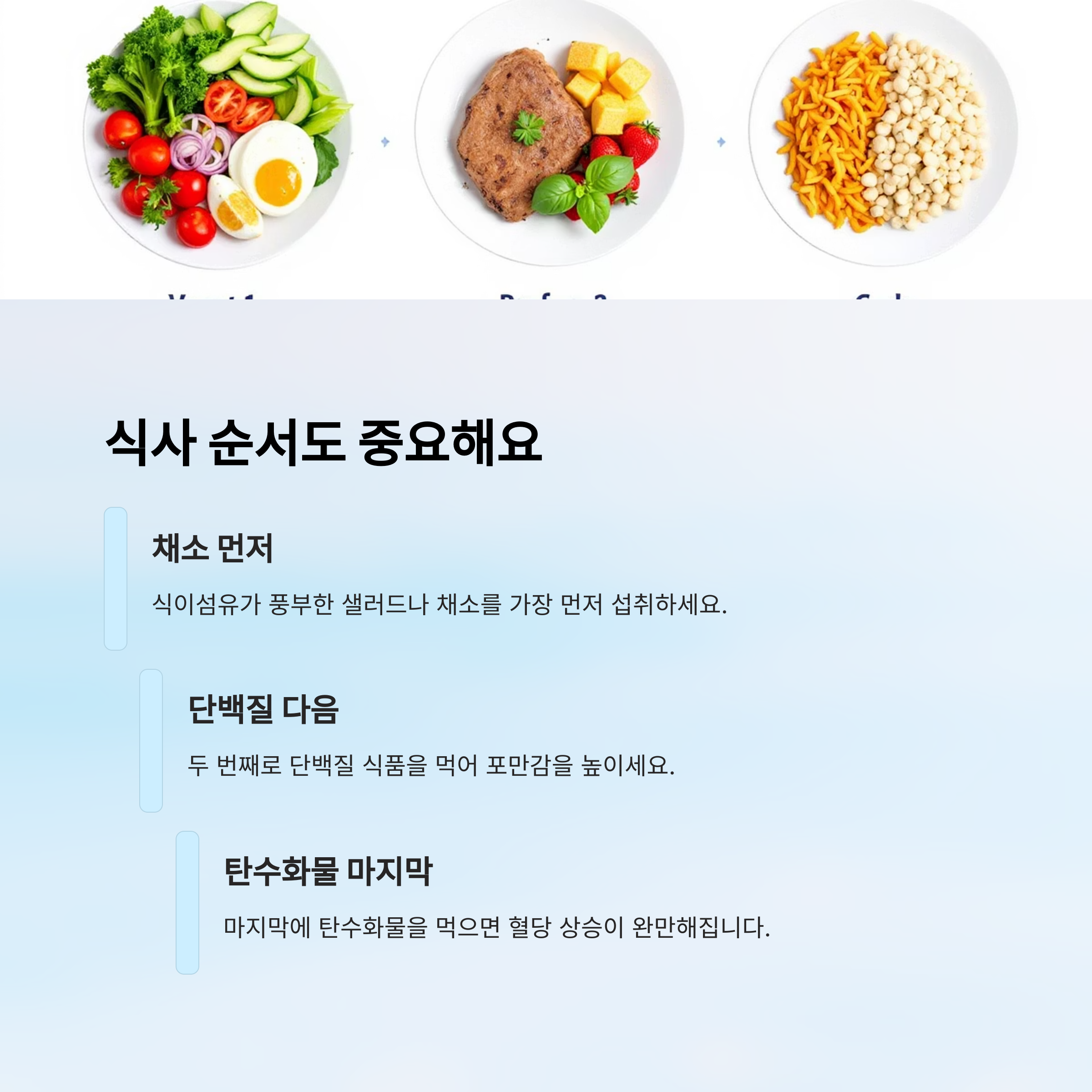 탄수화물 양도 중요하지만, 식사 순서도 생각해 보면 좋아요. 식이섬유가 풍부한 샐러드나 채소를 먼저 먹고, 단백질을 섭취한 후 탄수화물을 먹으면 혈당이 천천히 올라가서 인슐린 분비가 줄어들어요. 결국 살이 덜 찌는 식사 순서가 되는 거죠 🍽️