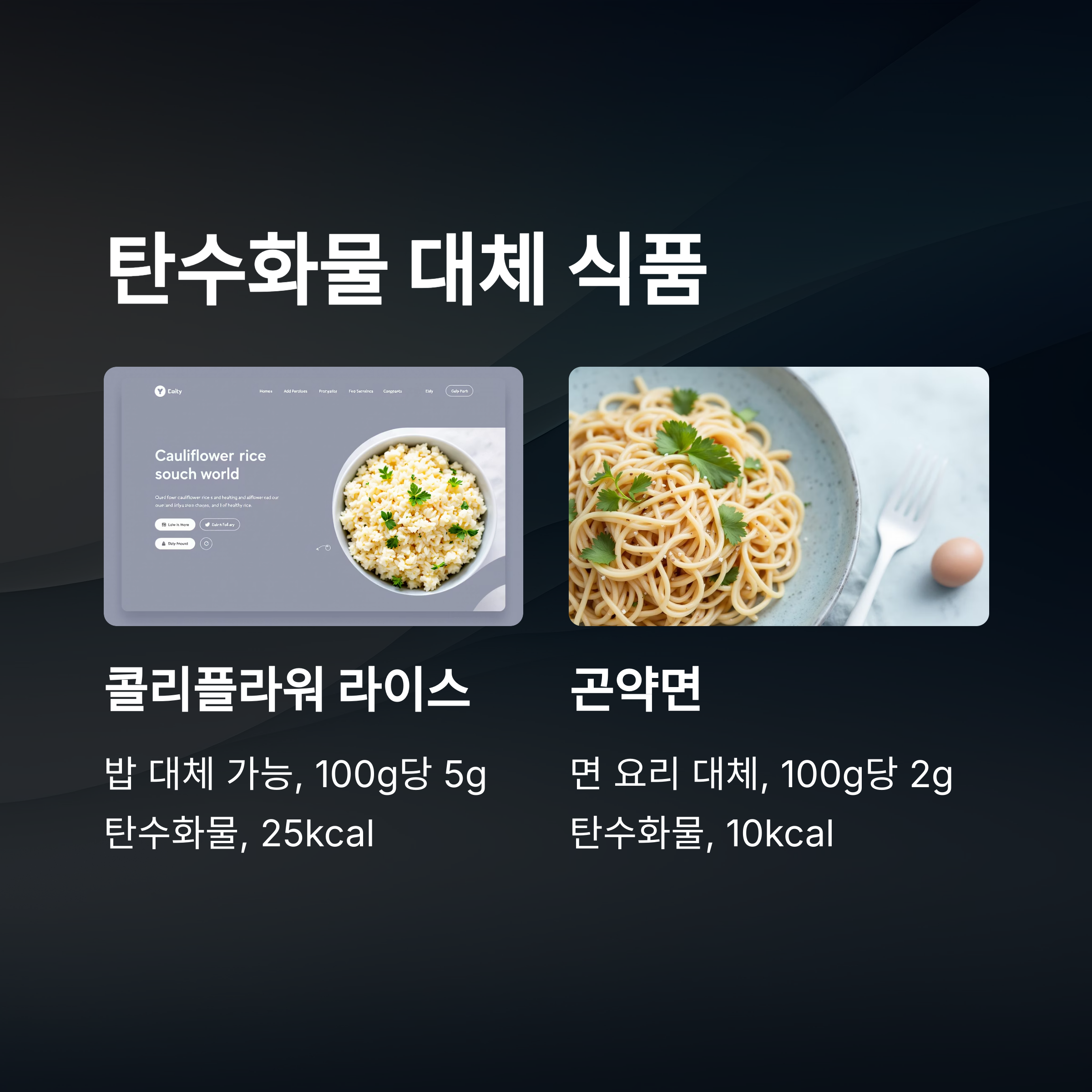 대표적인 대체 식품은 곤약, 콜리플라워 라이스, 두부면 등이 있어요. 이런 식품들은 실제 탄수화물 함량은 매우 낮지만 식감이 좋아서 밥이나 면처럼 활용할 수 있죠. 특히 곤약은 물에 불리면 양이 많아져서 심리적인 포만감도 느낄 수 있어요.
