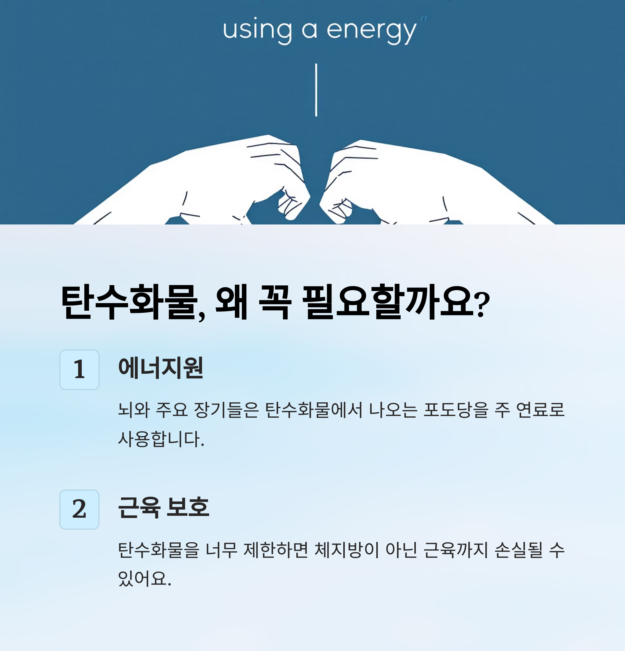 또한, 탄수화물을 너무 제한하면 체지방이 아니라 근육까지 빠질 수 있어요. 그러면 대사량도 줄어들고 요요도 더 빨리 올 수 있답니다.