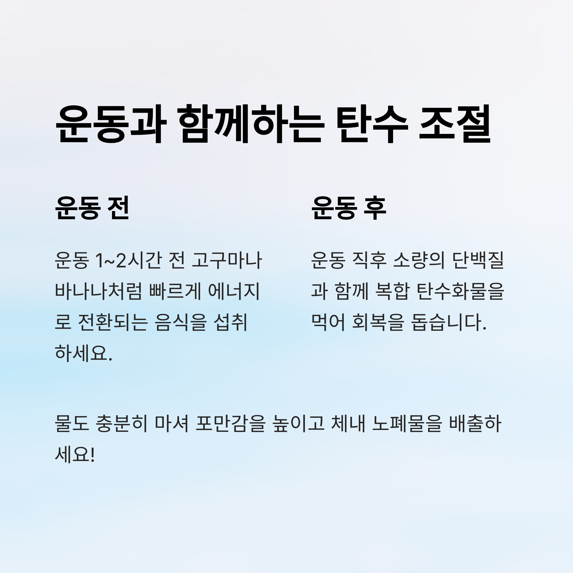 운동을 하는 분들은 운동 전후 타이밍에 따라 탄수화물 섭취 방법을 다르게 가져가면 더 효과적이에요. 운동 1~2시간 전엔 고구마나 바나나처럼 빠르게 에너지로 전환되는 음식을, 운동 직후엔 소량의 단백질과 함께 복합 탄수화물을 먹어주면 회복에 좋아요.