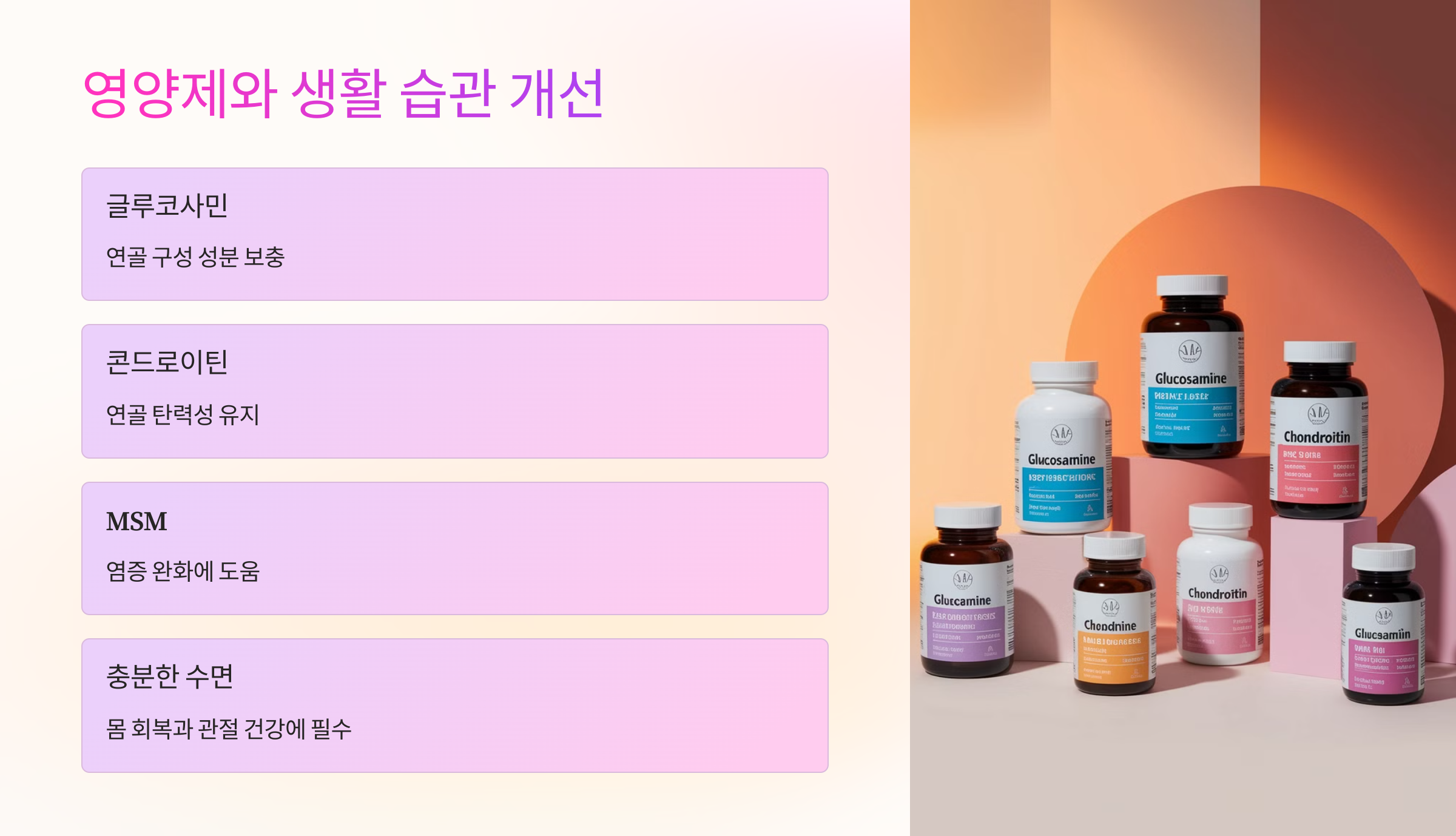 연골 건강을 유지하기 위해서는 음식뿐만 아니라 영양제를 활용하는 것도 좋아요. 대표적으로 글루코사민, 콘드로이틴, MSM 등이 연골 건강에 도움을 줄 수 있어요.