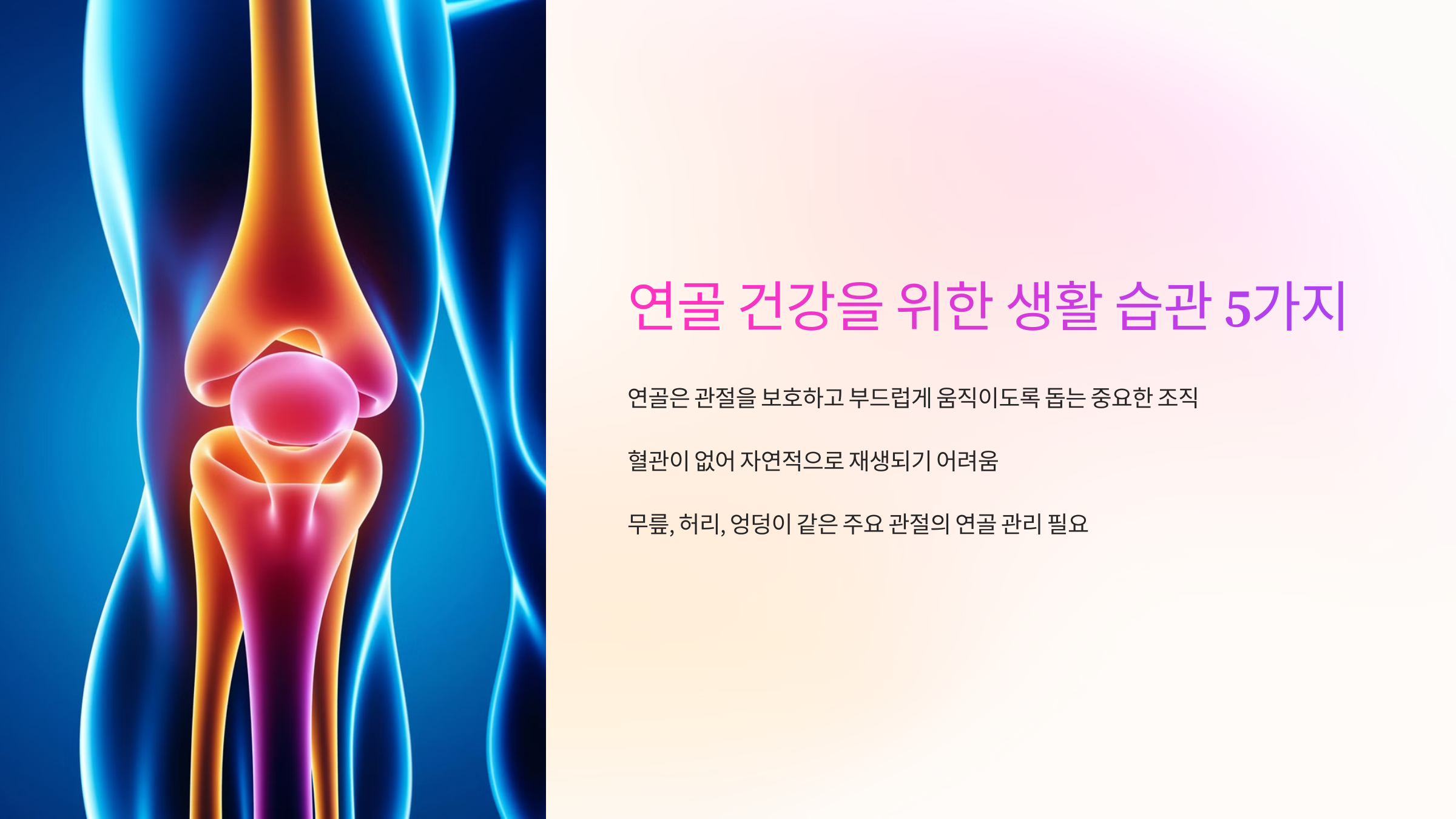 오늘은 연골 건강을 지키는 5가지 생활 습관을 소개할게요. 무릎 관절부터 허리까지 건강하게 유지하는 방법을 함께 알아봐요!