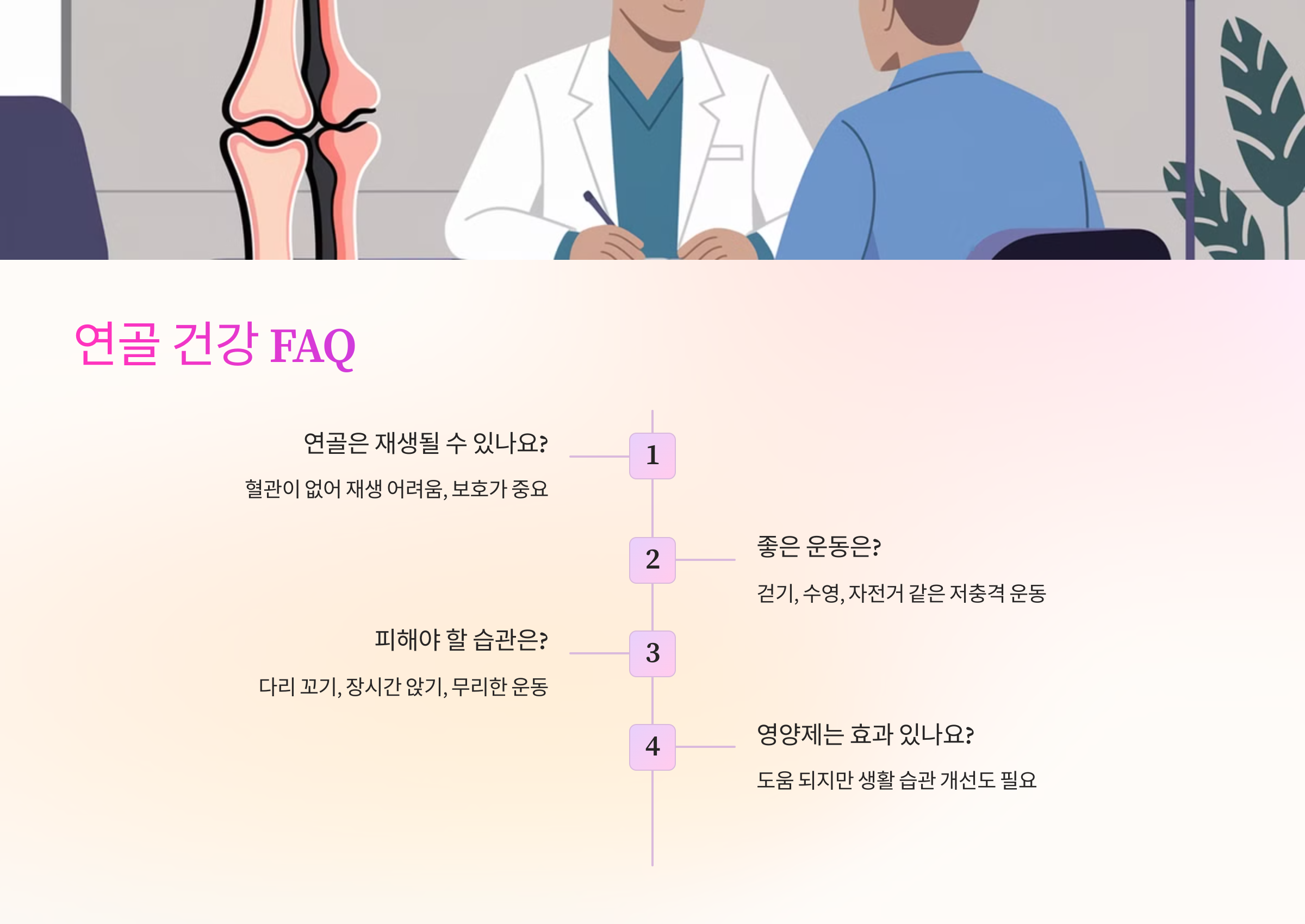 A1. 연골에는 혈관이 없어 자연적으로 재생되기 어렵지만, 올바른 생활 습관과 영양 섭취로 손상을 줄이고 보호할 수 있어요.