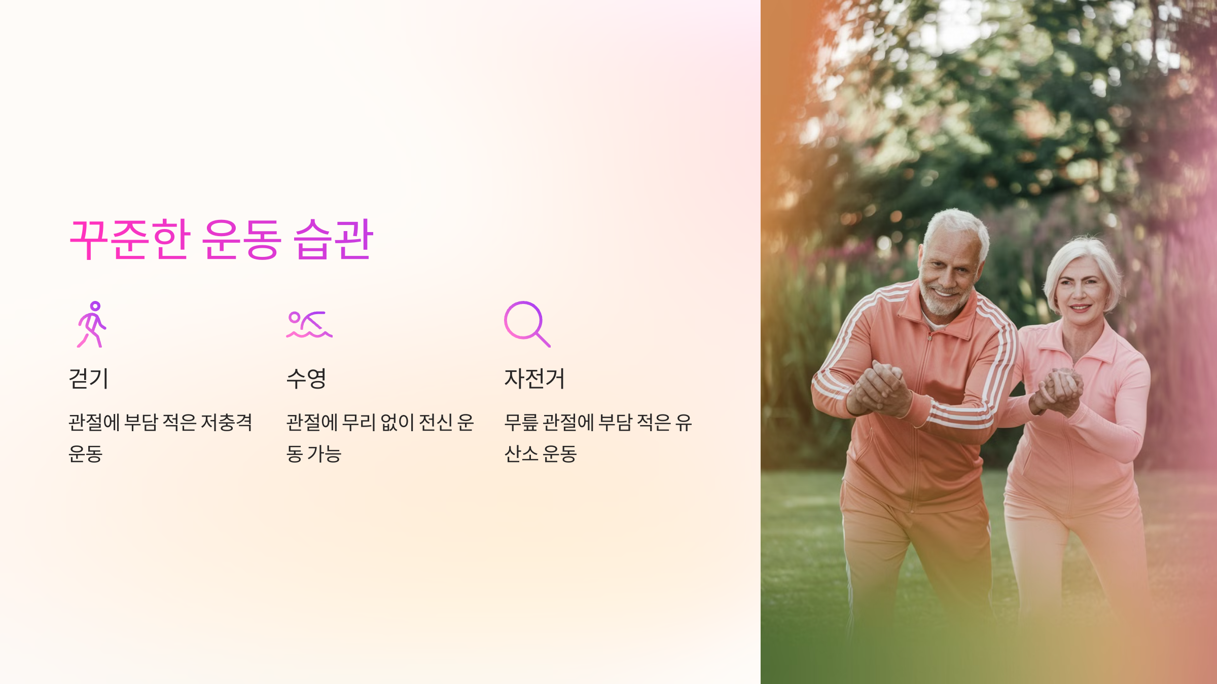 하루 30분 정도 꾸준히 운동하는 것이 연골 건강을 지키는 가장 좋은 방법이에요. 무릎과 허리를 보호하면서 건강한 생활을 유지해 보세요!