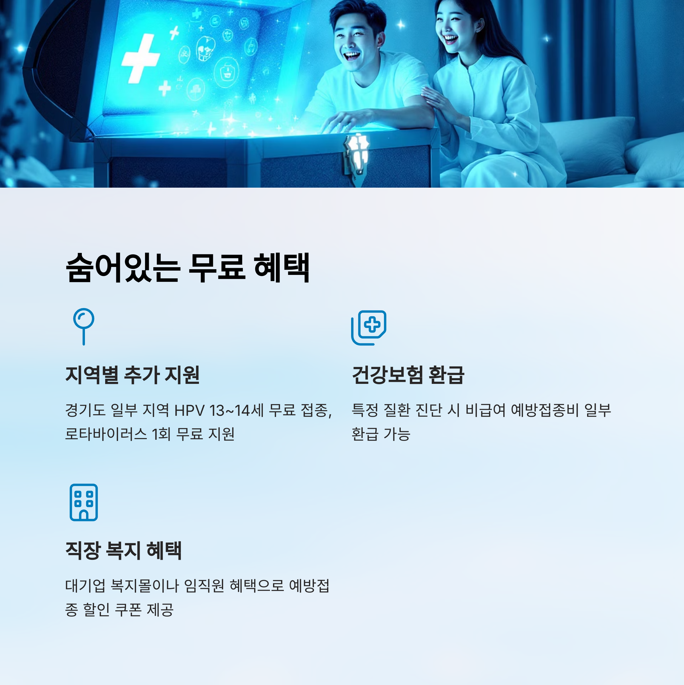 많은 부모님들이 병원에서 안내해주는 기본 접종 외에는 대부분 유료로 생각하곤 해요. 하지만 알고 보면 정부, 지자체, 일부 건강보험공단 등에서 숨어서(?) 제공하는 무료 혜택도 적지 않답니다. 특히 저소득층, 다자녀, 맞벌이 가정 등은 추가 지원 대상이 될 수도 있어요! 🤫