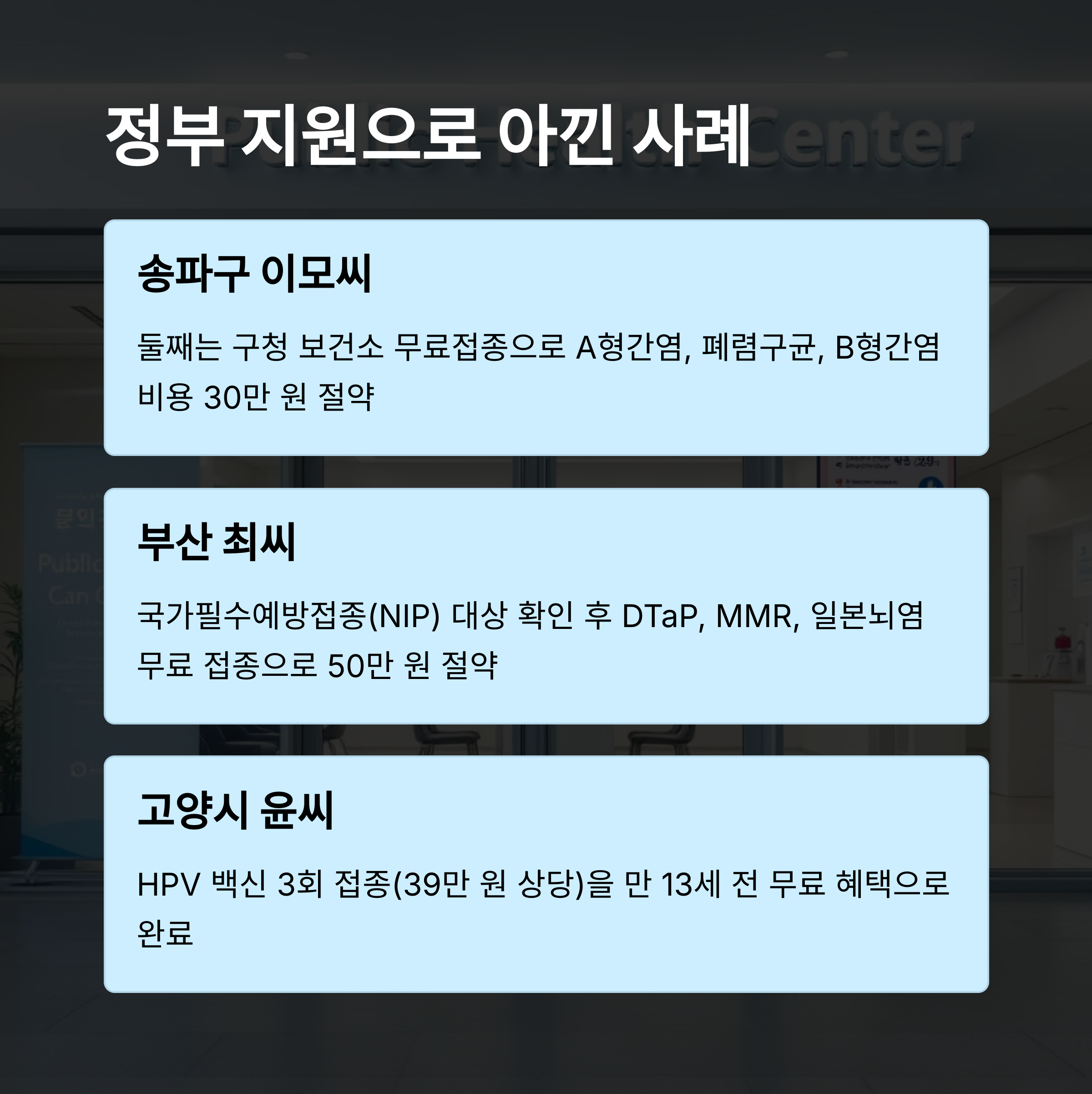 서울 송파구에 사는 이모 씨는 첫째 아이 때 모든 예방접종을 일반 병원에서 자비로 진행했어요. 당시 A형간염, 폐렴구균, B형간염만 해도 30만 원이 넘게 들었죠. 그런데 둘째를 키우면서 구청 보건소의 무료접종을 알게 되었고, 동일한 백신을 한 푼도 들이지 않고 접종할 수 있었답니다.