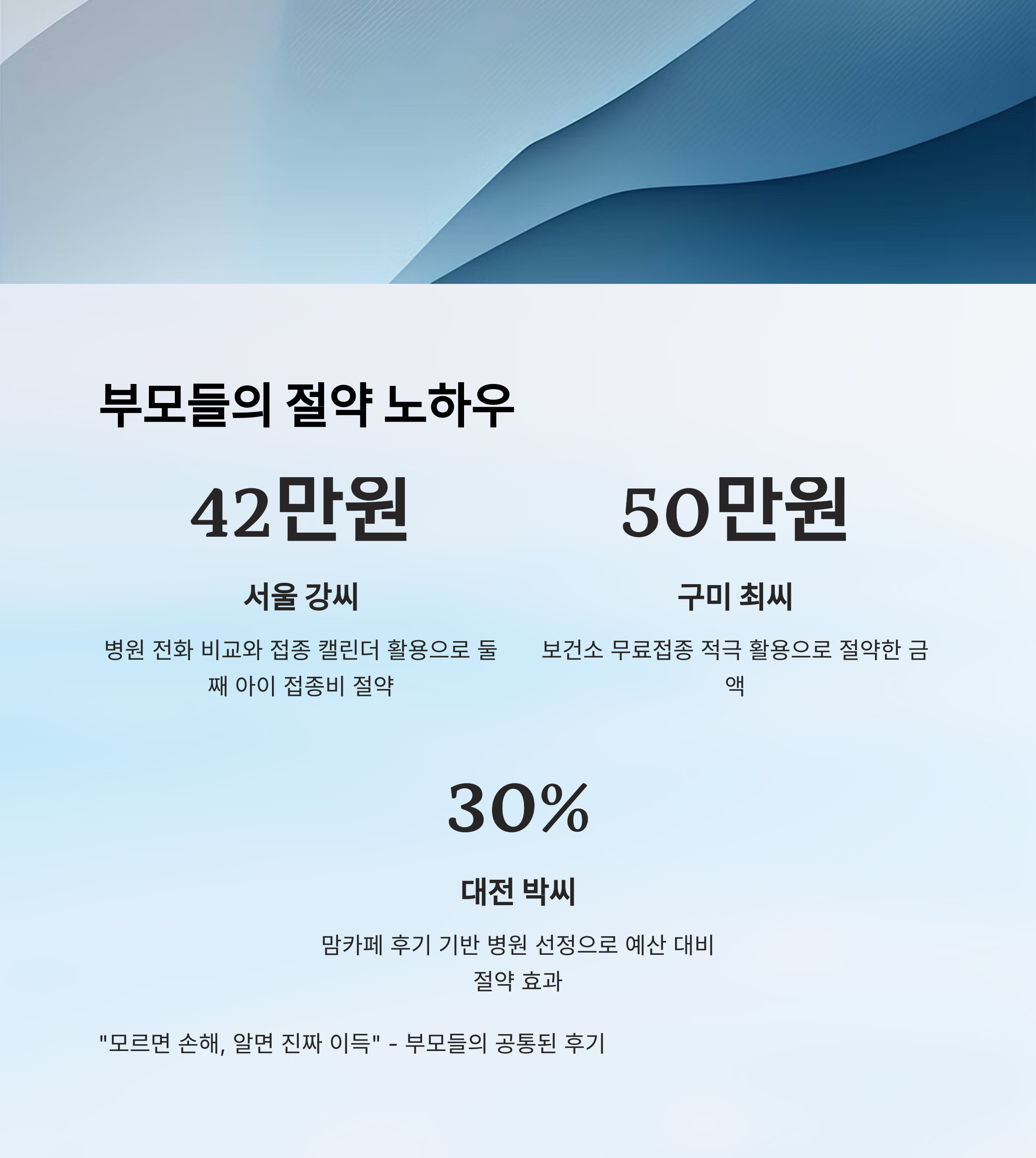 | 서울 강씨 | 병원 전화 비교, 접종 캘린더 활용 | 42만 원 | 첫째·둘째 비교 |