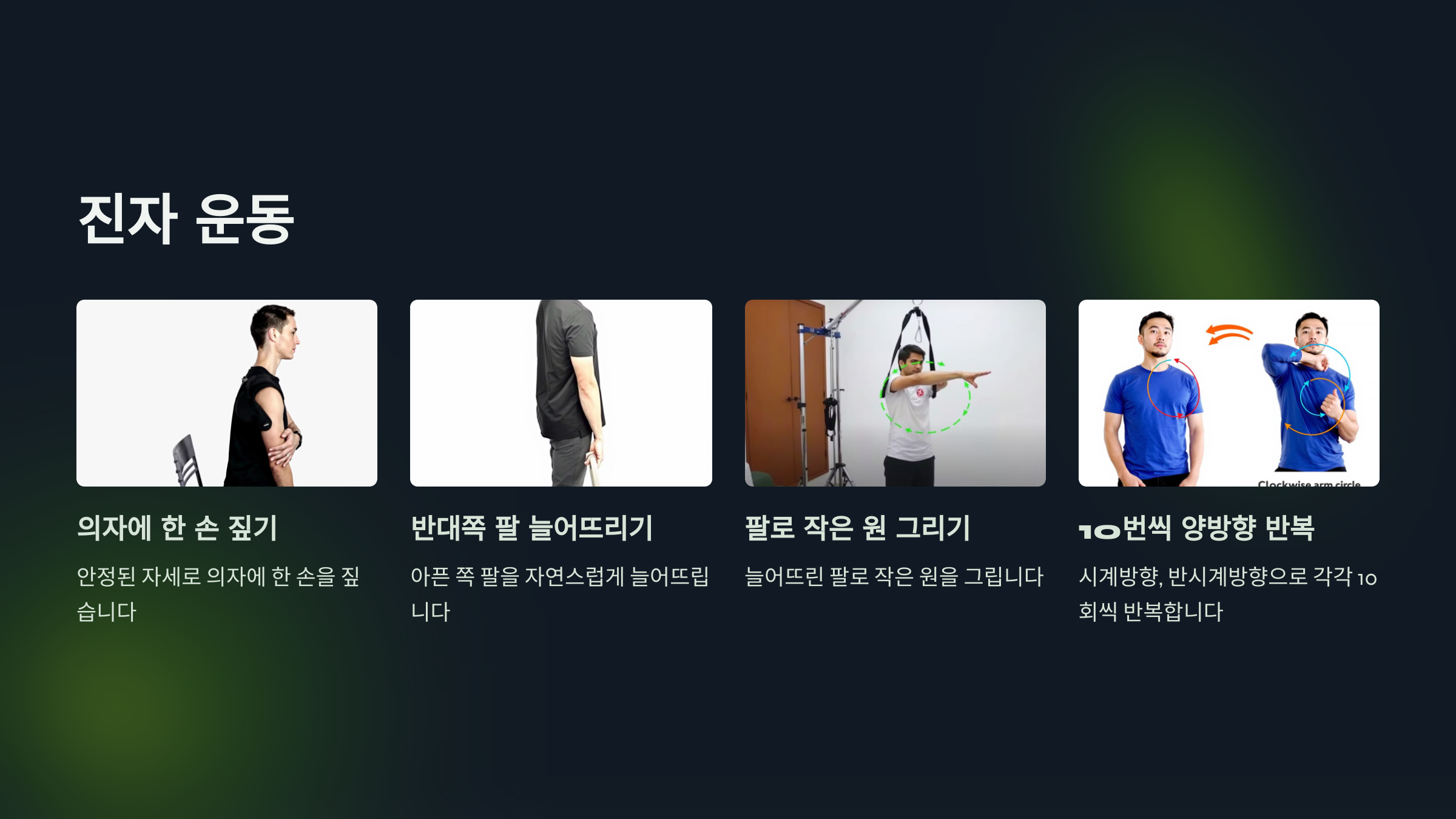 - 효과: 어깨 관절을 부드럽게 움직여 유착을 완화하고 혈액순환을 촉진합니다.