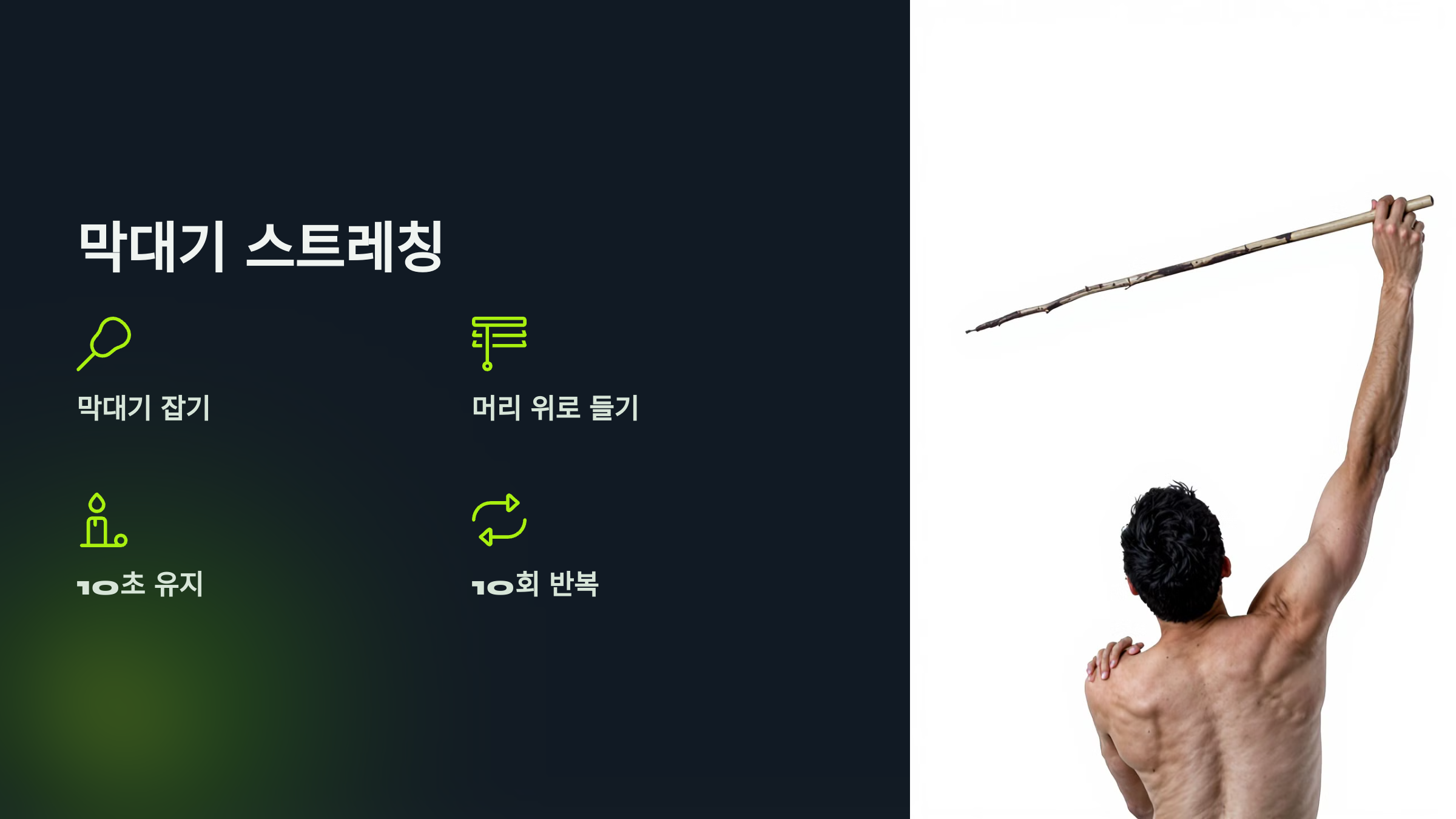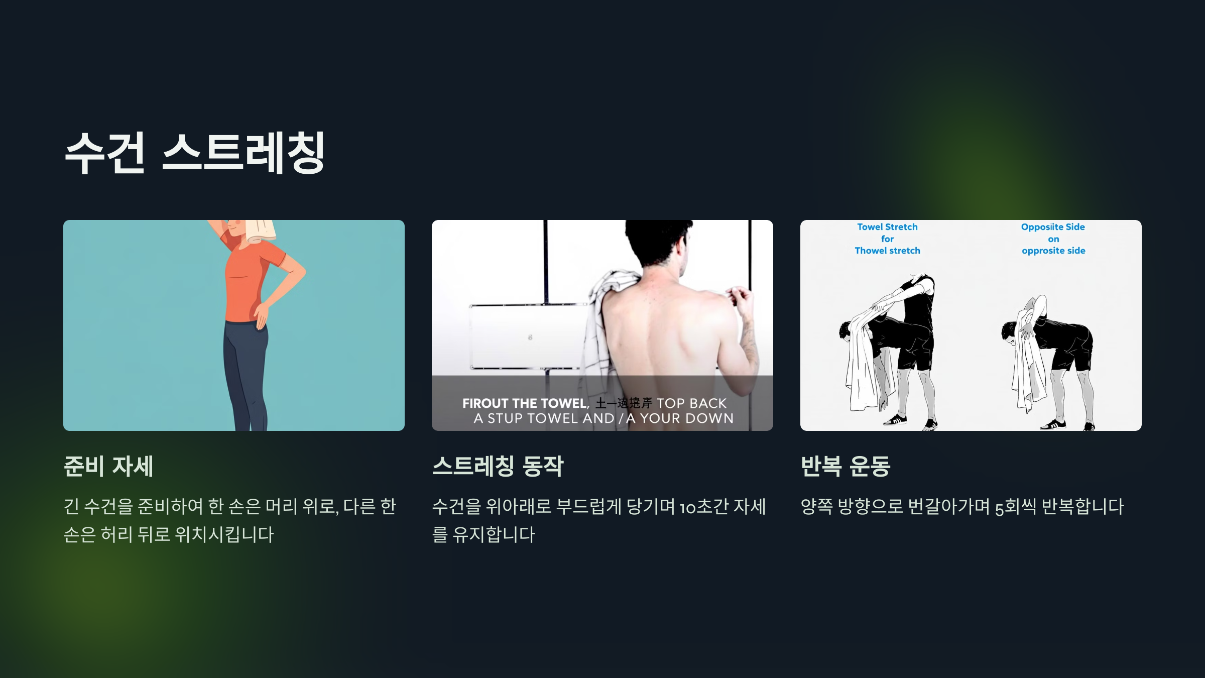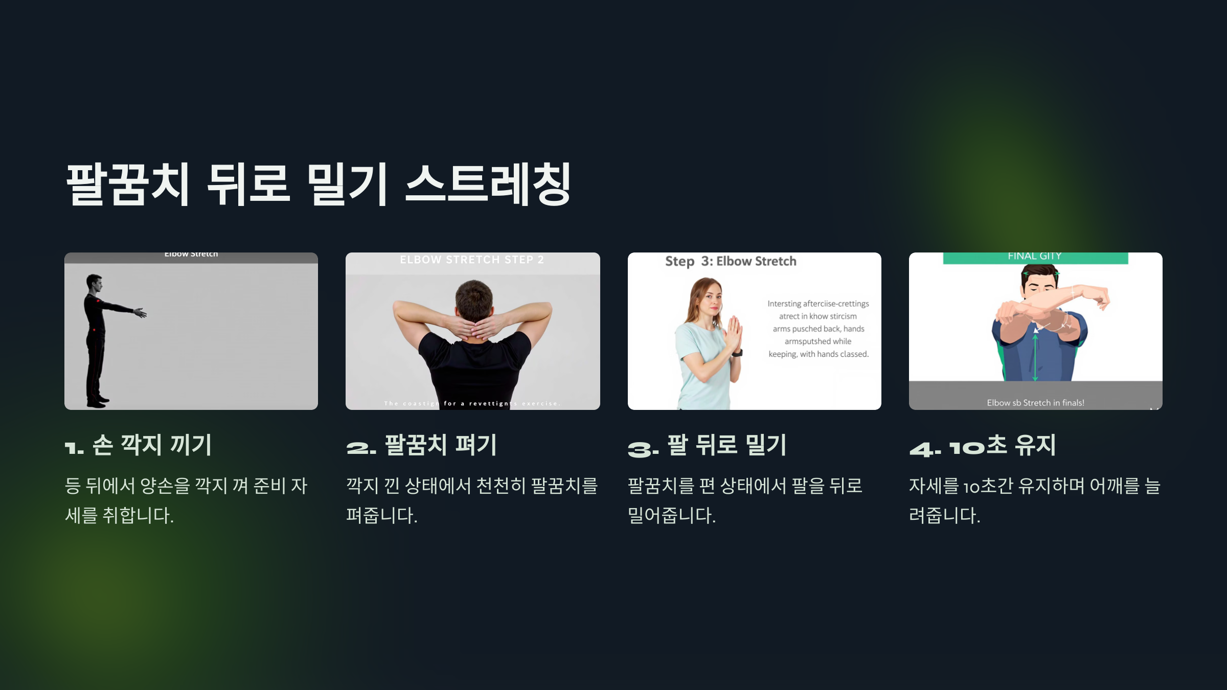 - 효과: 굳어진 어깨 근육과 관절을 부드럽게 늘려줍니다.