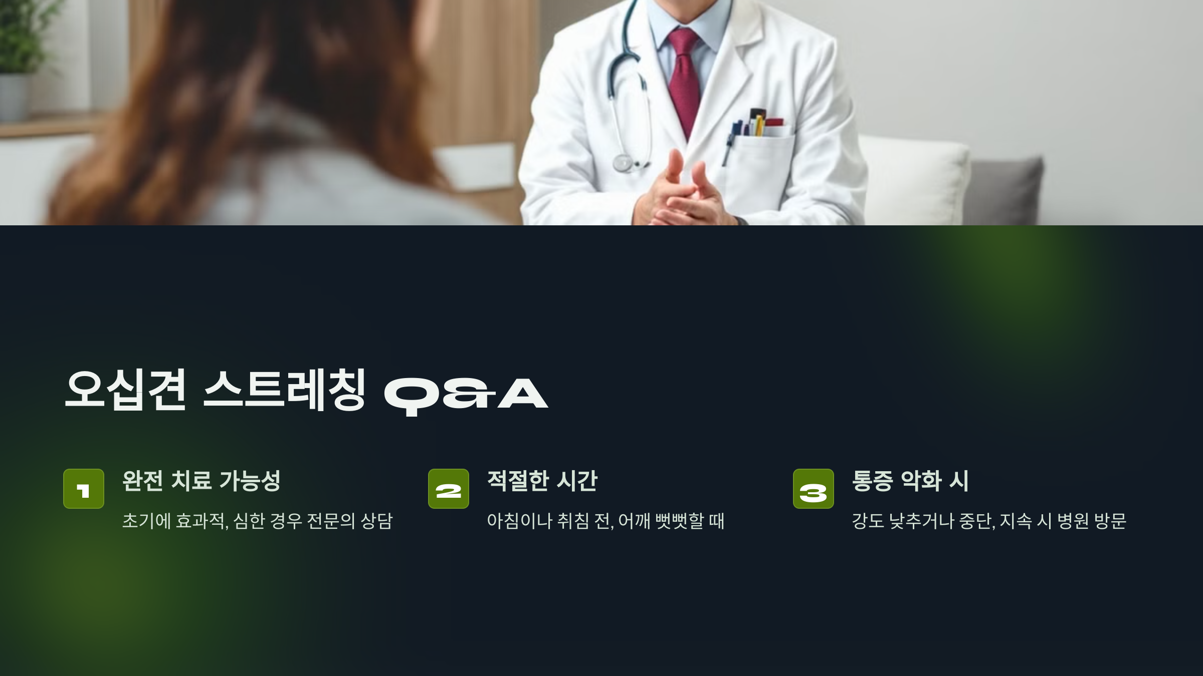 A: 초기 단계의 오십견이라면 스트레칭만으로도 큰 효과를 볼 수 있어요. 하지만 통증이 심한 경우 전문의와 상담 후 물리치료나 약물 치료를 병행하는 것이 좋습니다.