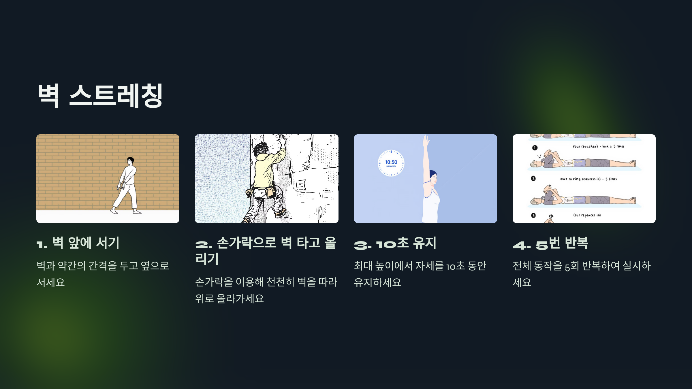 - 벽 앞에 서서 손가락을 벽에 대고 천천히 위로 올려주세요.