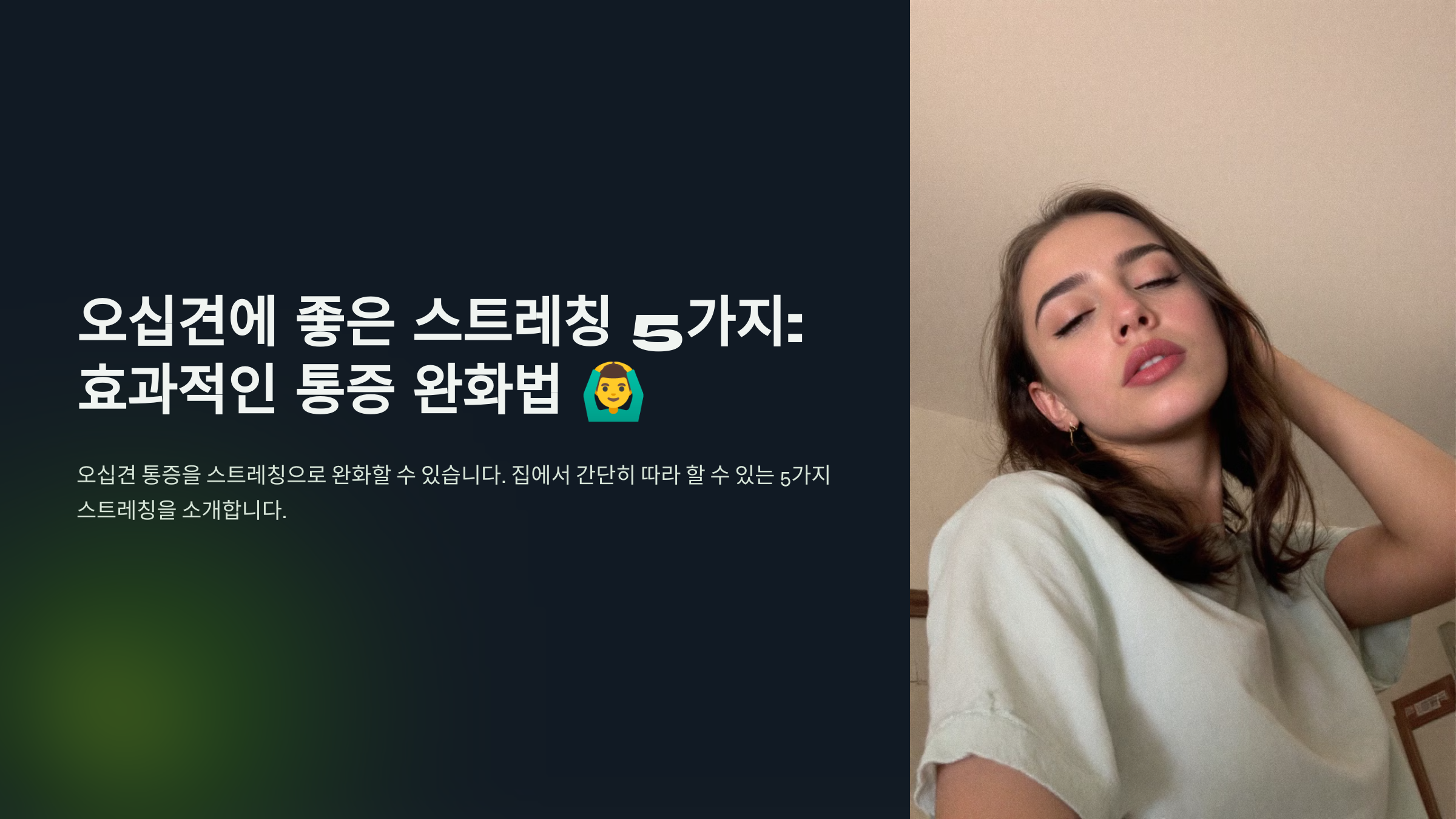오늘은 집에서도 간단히 따라 할 수 있는 오십견 스트레칭 5가지를 소개할게요. 😊 어깨를 다시 자유롭게 움직이는 날까지 함께해요!
