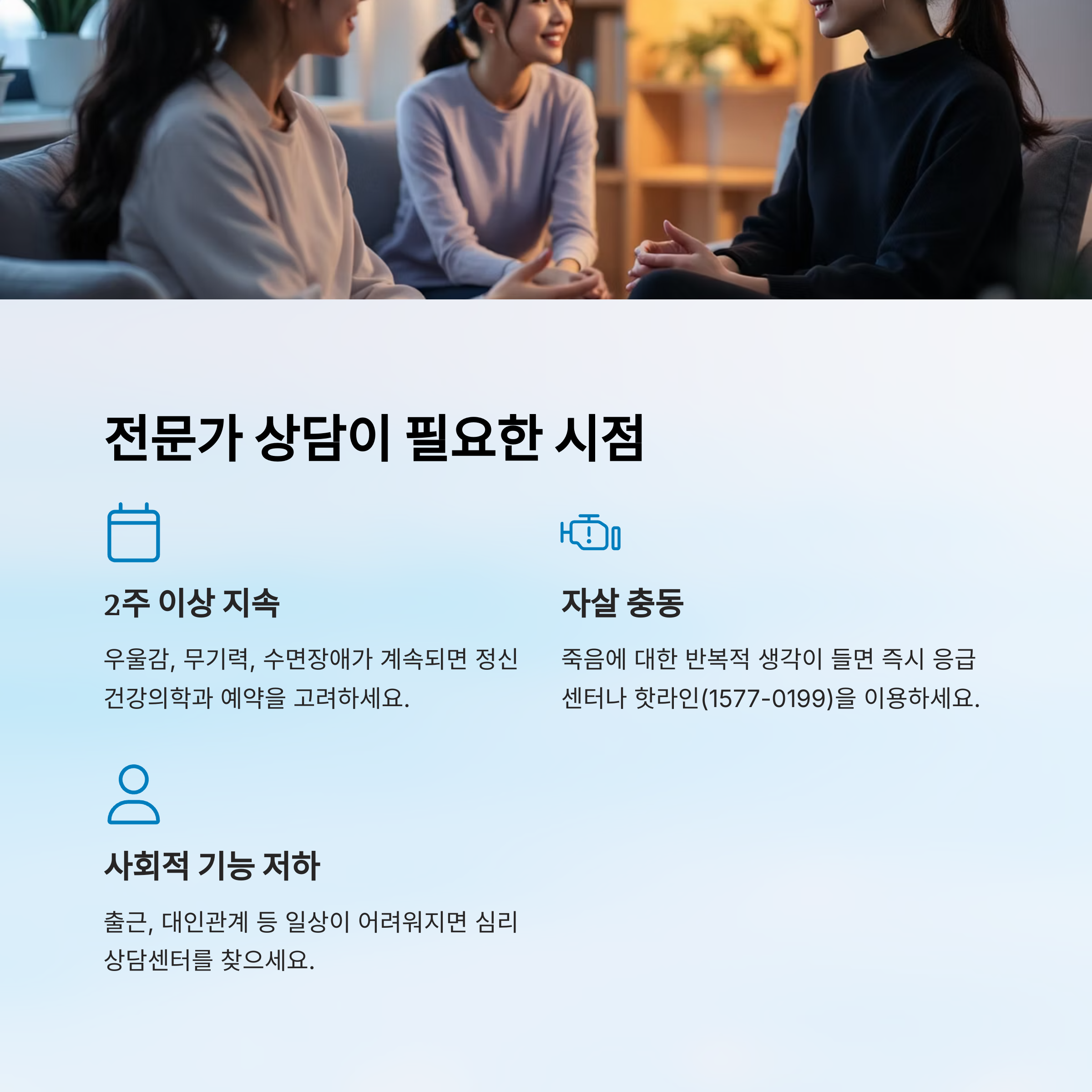 | 2주 이상 지속 | 우울감, 무기력, 수면장애 | 정신건강의학과 예약 |