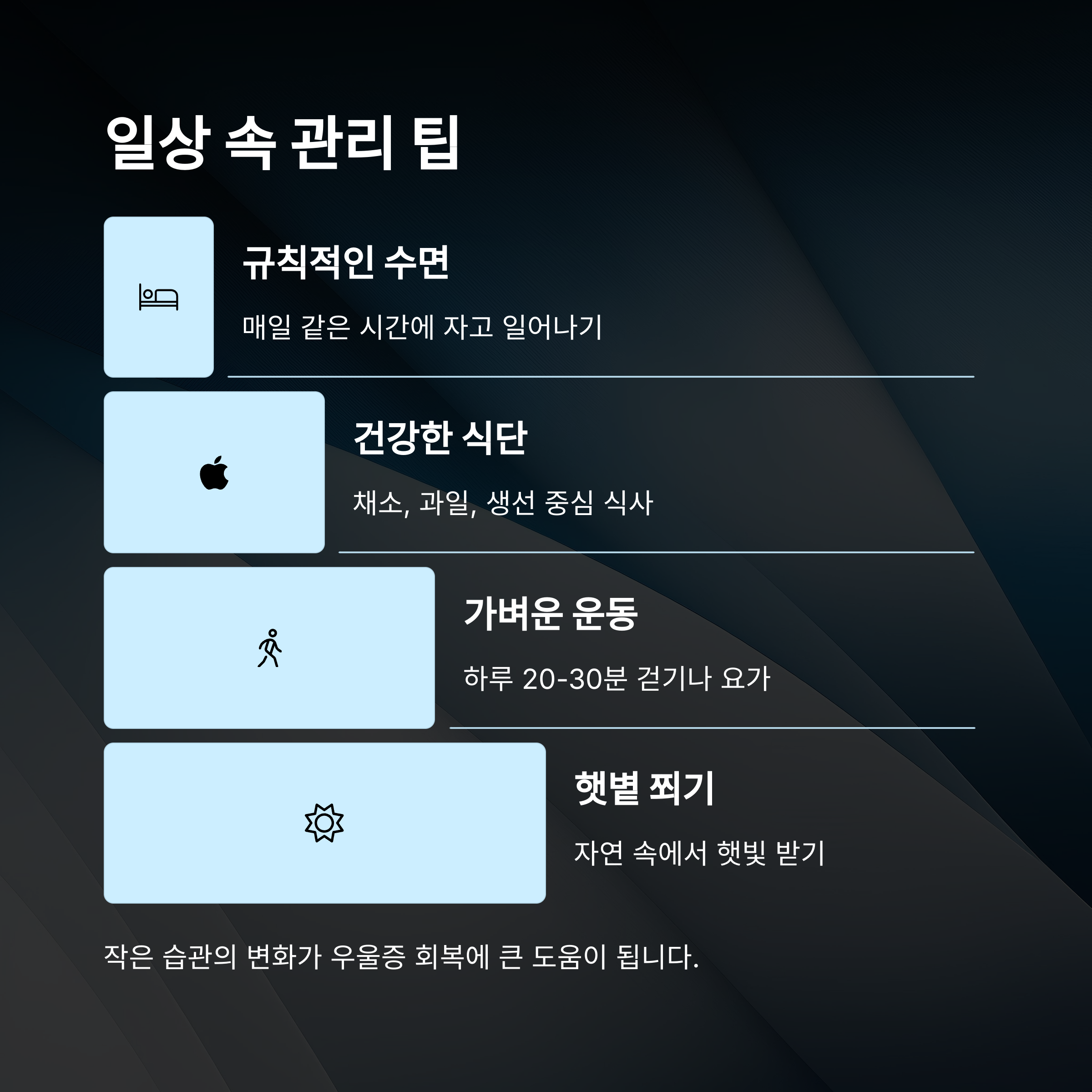 첫 번째로는 규칙적인 수면이 필수예요. 밤낮이 뒤바뀐 생활은 뇌의 회복을 방해해서 우울감을 심화시킬 수 있어요. 매일 같은 시간에 자고 일어나는 습관을 들이면 신체 리듬이 안정되고 감정도 조금씩 평온해져요.