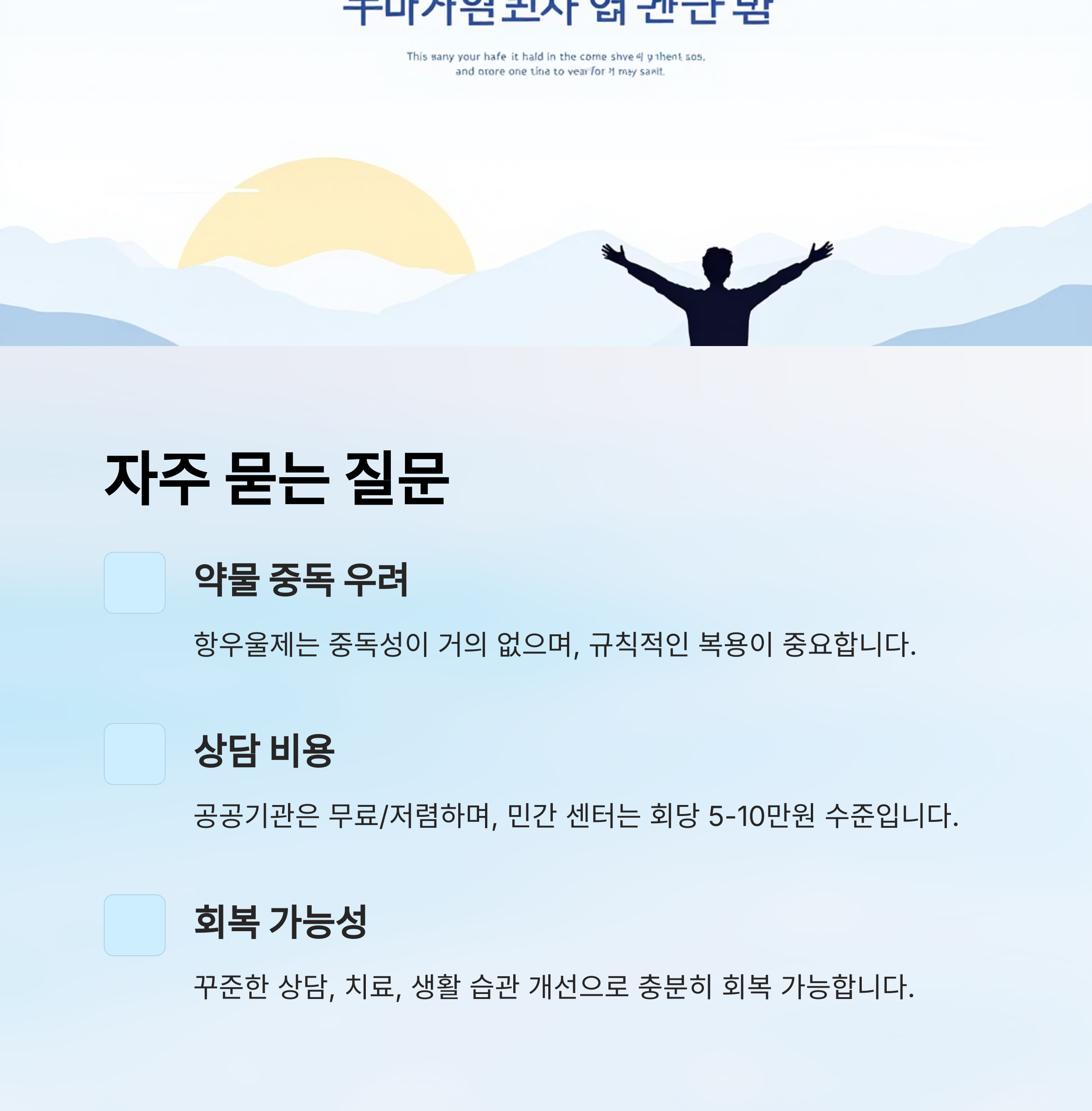 A8. 충분히 가능해요! 꾸준한 상담, 치료, 생활 습관 개선을 통해 많은 사람들이 우울증에서 벗어나고 있어요. 나도 그중 하나가 될 수 있어요 🍀