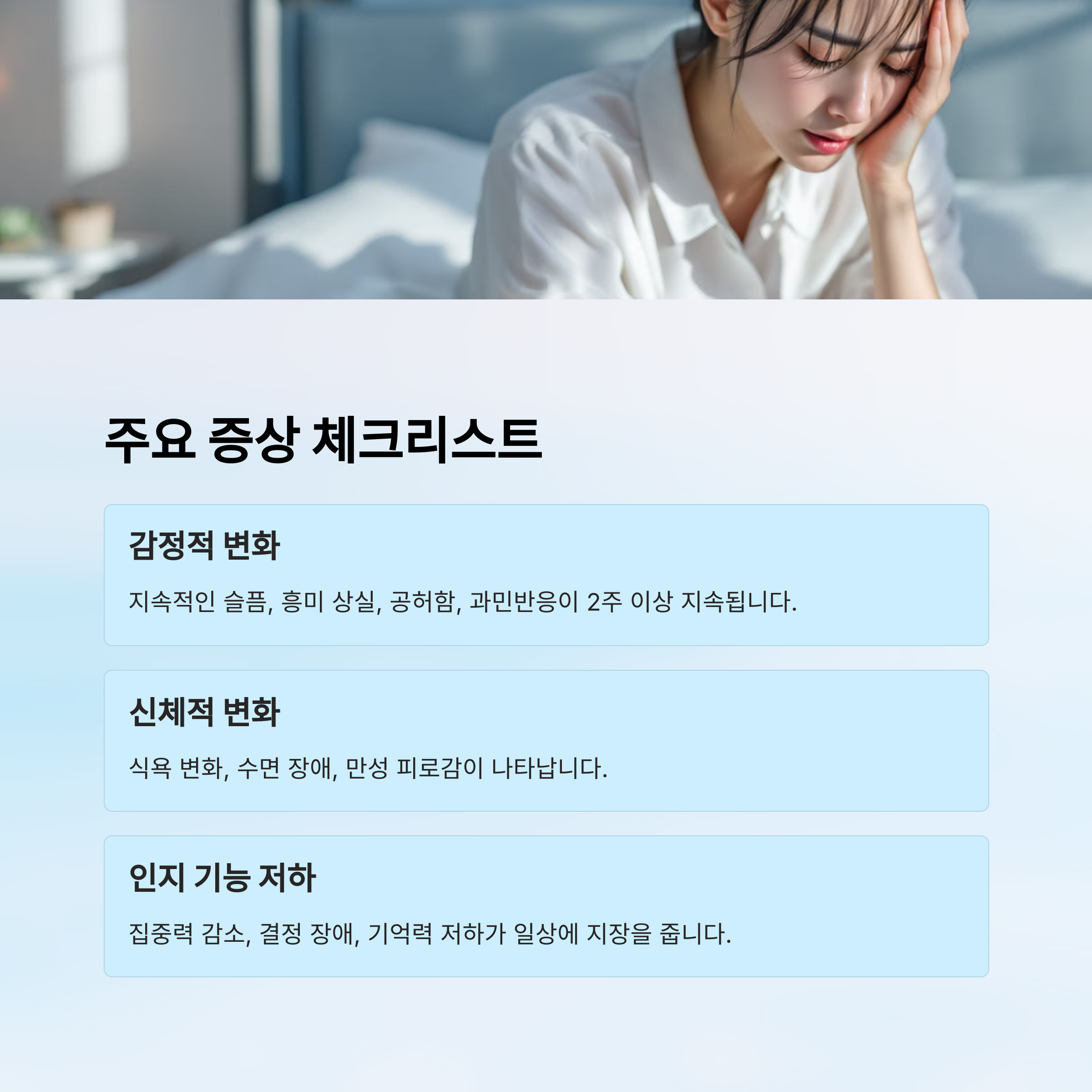 | 감정 변화 | 슬픔, 무기력, 흥미 상실 | 2주 이상 지속 |