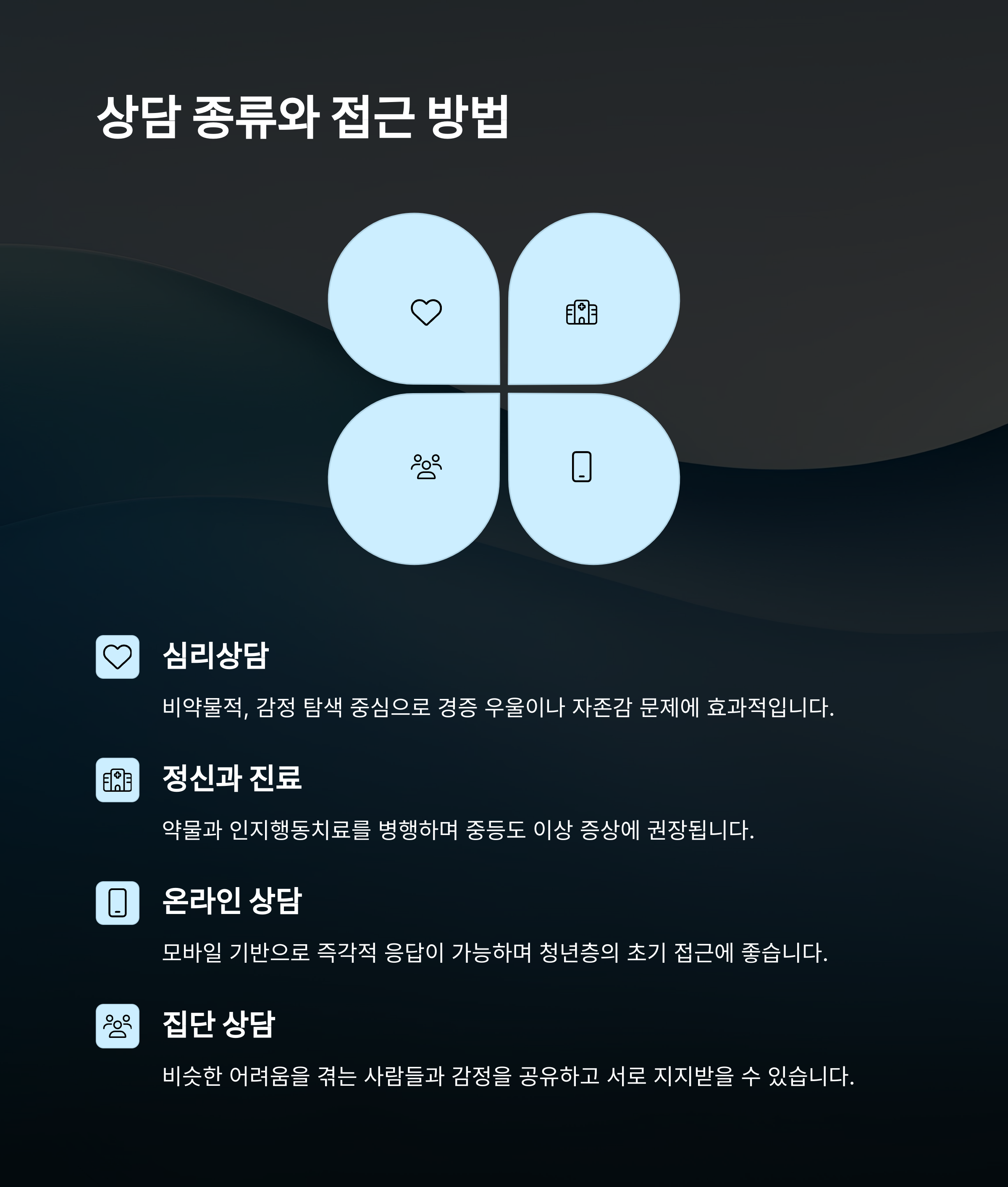 | 온라인 상담 | 비대면 심리사 또는 챗봇 | 모바일 기반, 즉각적 응답 | 청년층, 초기 접근 |