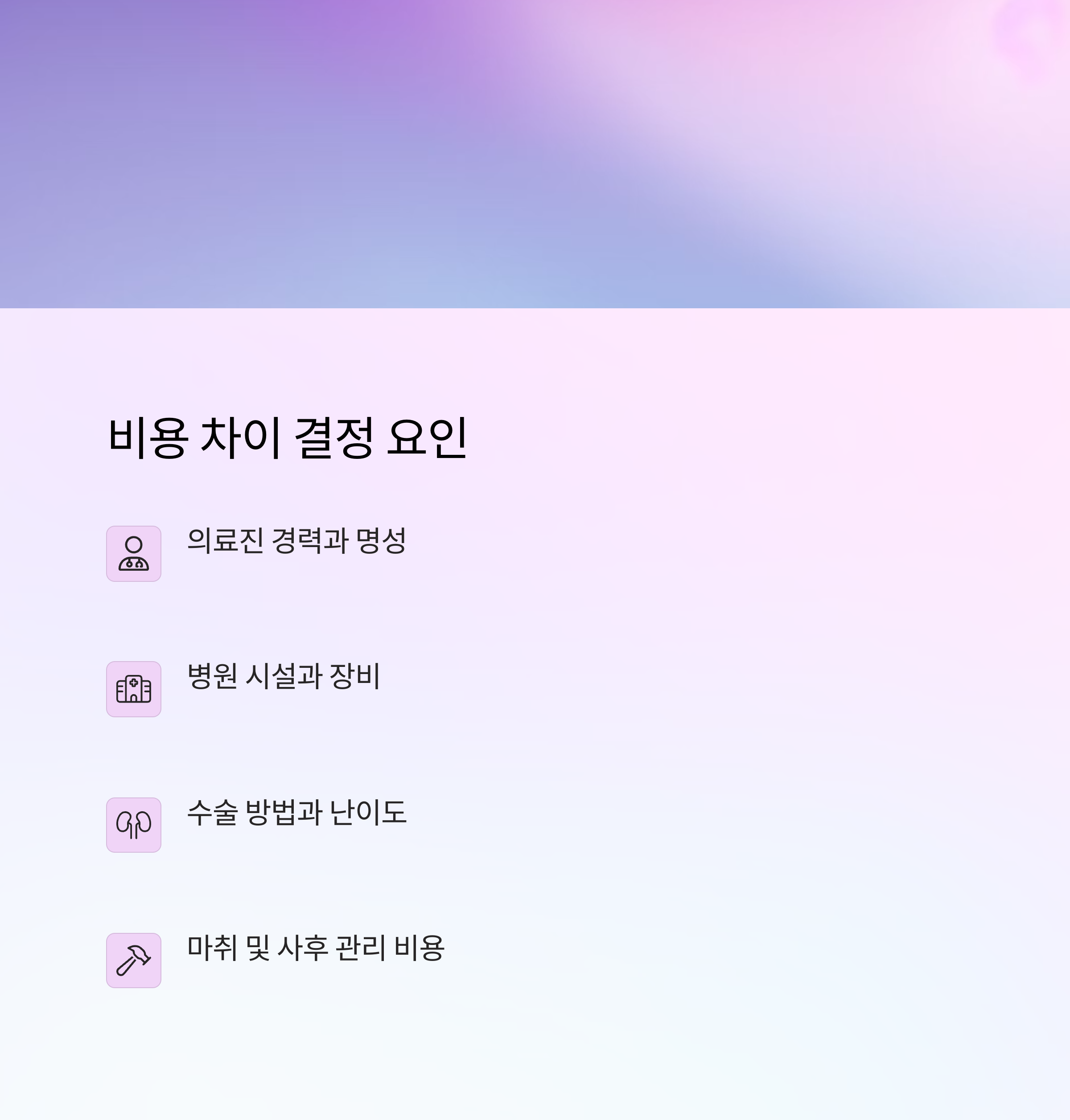 | 수술 집도의 | 경력 많을수록 높음 | 유명 원장님일수록 비용 상승 |