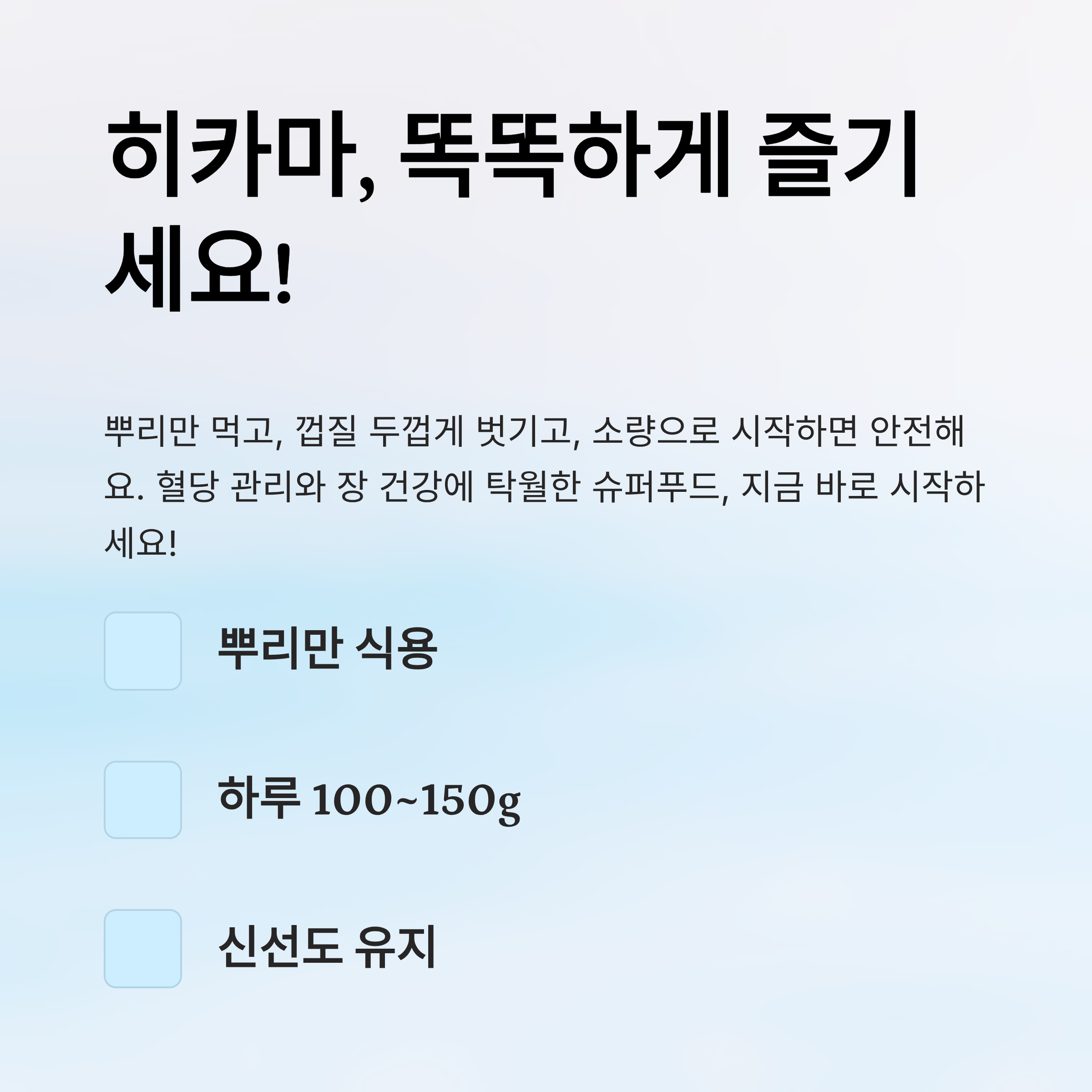 이 표처럼 기본적인 안전 수칙만 지키면 히카마는 누구나 건강하게 즐길 수 있어요. 올바른 손질과 섭취 방법을 습관화하면 건강은 물론 맛까지 두 배로 누릴 수 있답니다. 🍽️