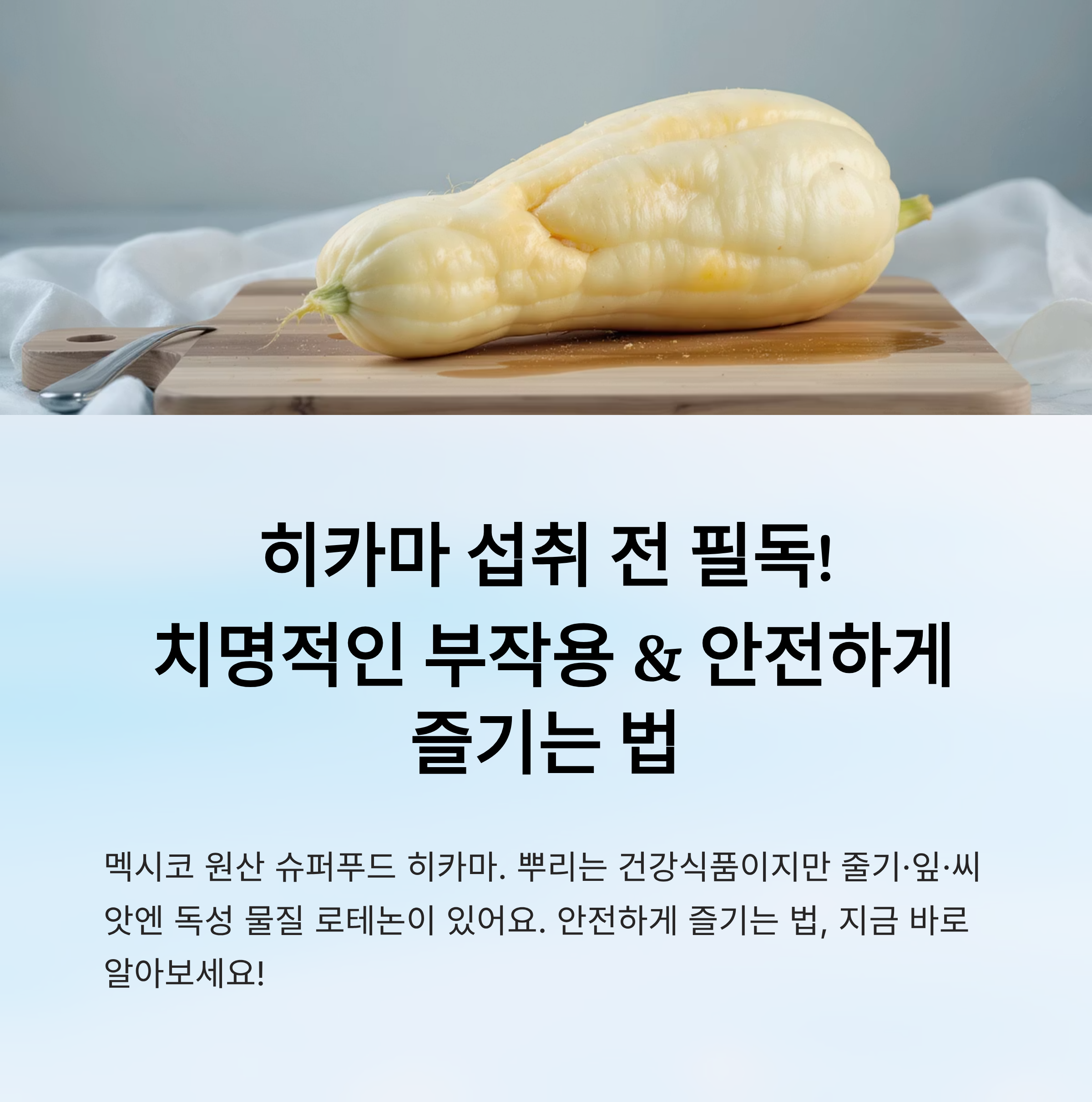 히카마를 안전하게 즐기려면 가장 먼저 기억해야 할 점은 뿌리만 먹는 거예요. 줄기, 씨앗, 잎에는 독성 물질인 로테논이 들어 있으니 절대 섭취하면 안 돼요. 뿌리만 골라 깨끗하게 손질해 먹어야 건강한 효능을 누릴 수 있답니다.