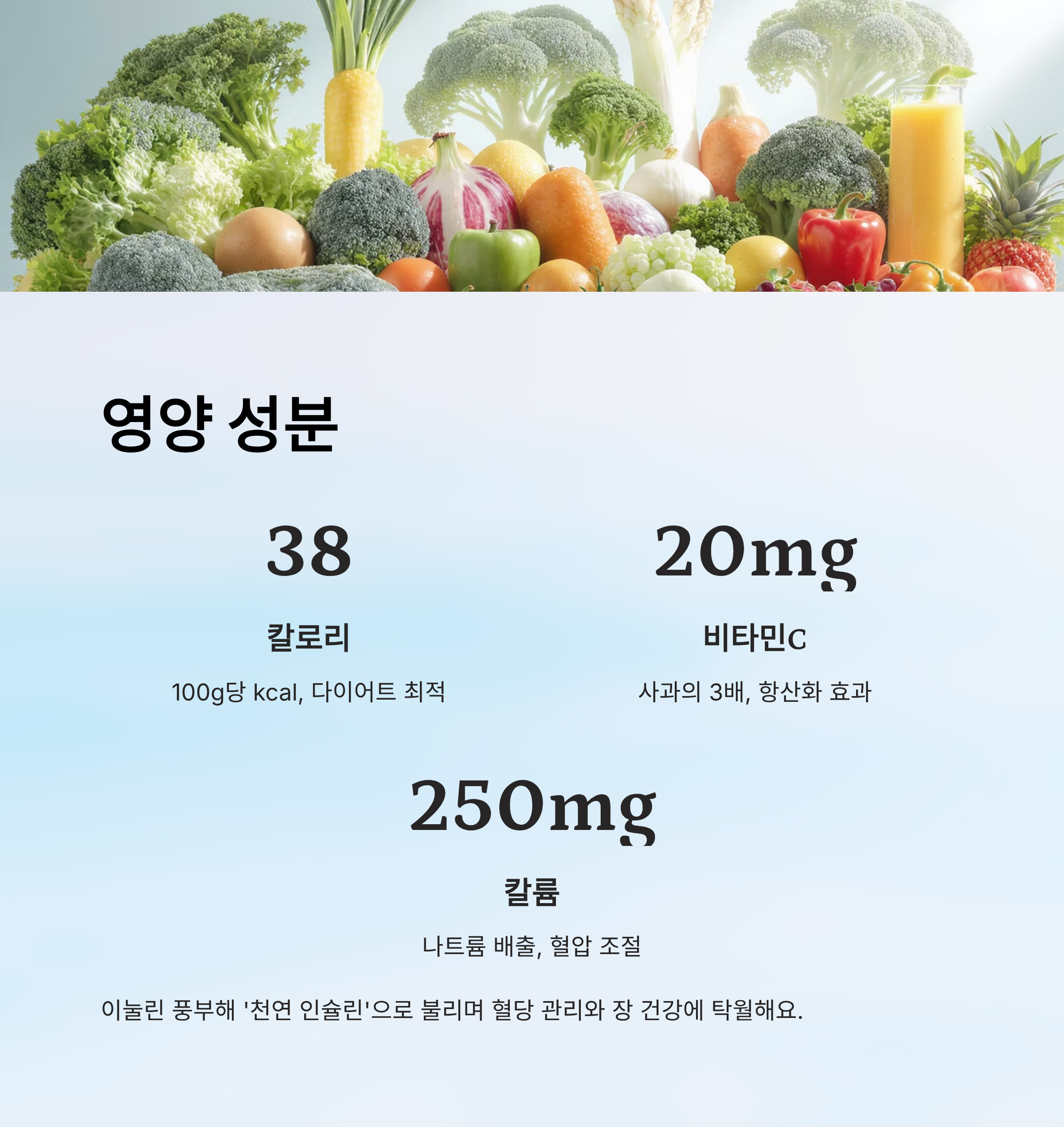 히카마의 가장 큰 매력은 바로 풍부한 영양소예요. 100g 기준으로 칼로리는 약 38kcal 정도밖에 되지 않아 매우 낮은 편이에요. 대신 수분과 식이섬유가 풍부해 포만감을 주면서도 부담 없이 섭취할 수 있답니다. 다이어트를 하는 사람들이 히카마를 찾는 이유가 바로 여기에 있어요.