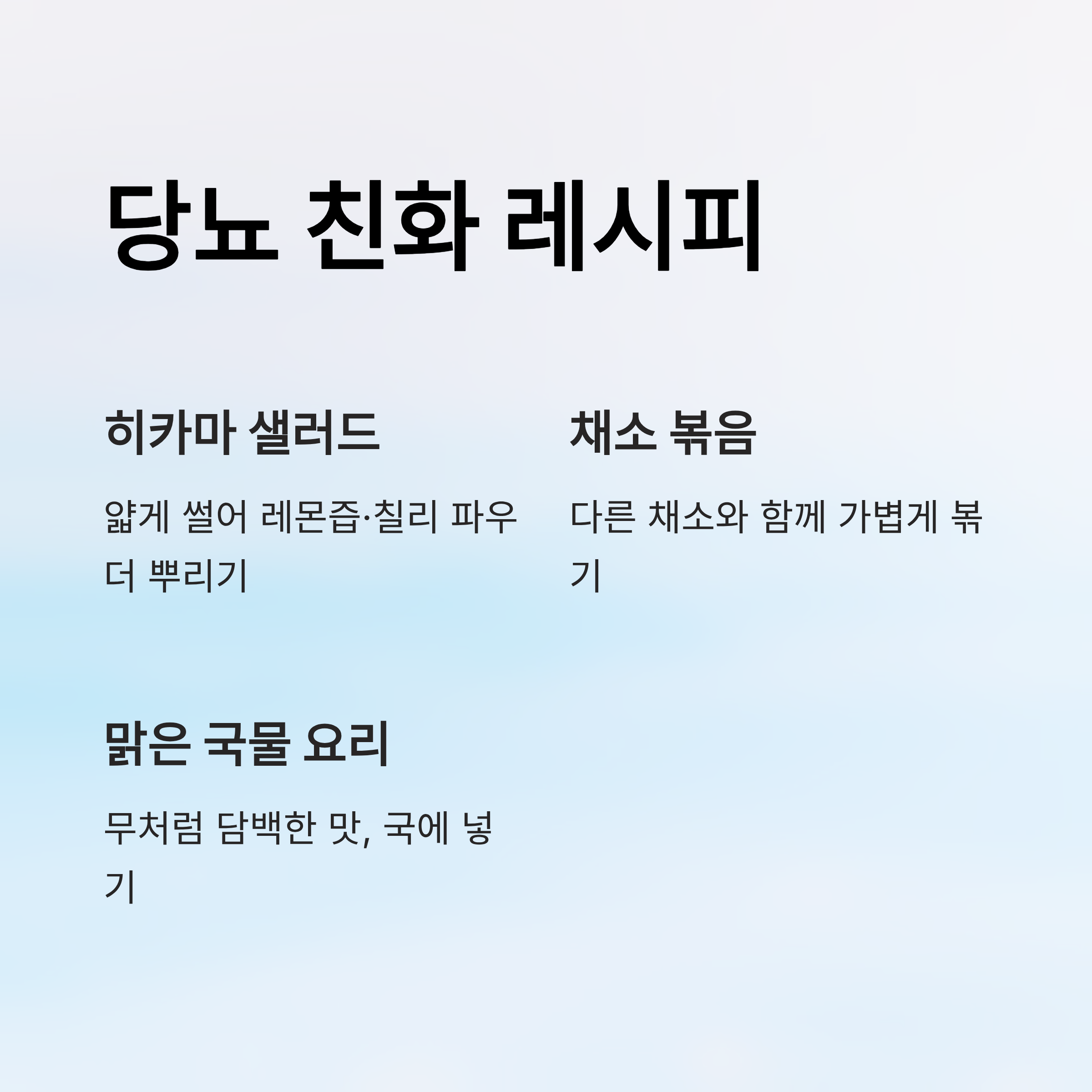이 표처럼 히카마는 다양한 방식으로 요리에 활용할 수 있어요. 특히 당뇨 환자는 조리 방식과 양을 조절해 건강하고 맛있게 즐길 수 있답니다. 🍴
