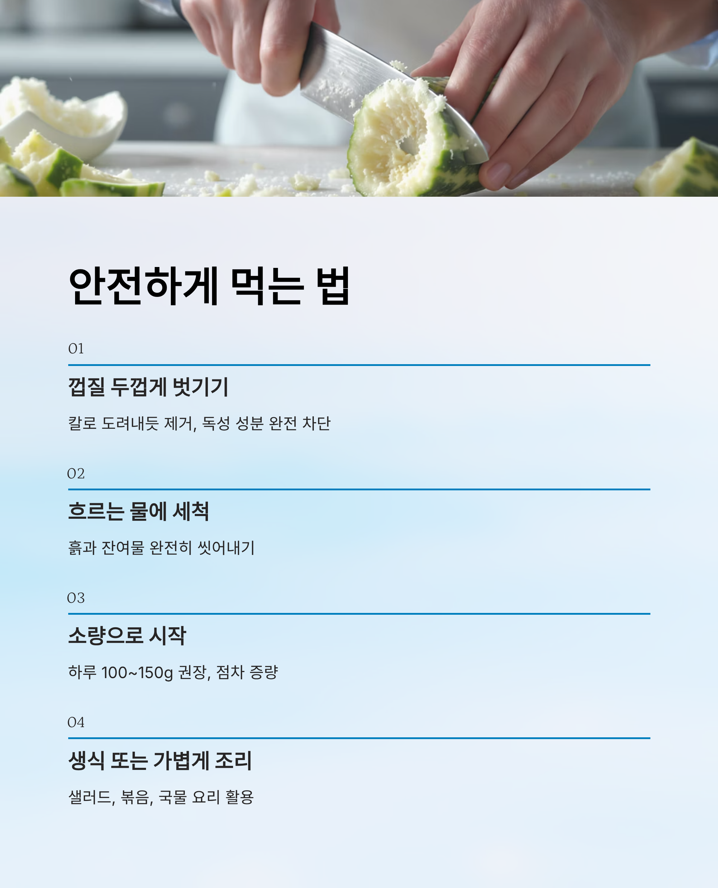 생으로 먹는 경우, 흐르는 물에 여러 번 씻어 껍질의 흙이나 잔여 성분을 완전히 제거해야 해요. 깨끗하게 손질한 후 얇게 썰어 샐러드로 먹으면 비타민C와 수분을 가장 잘 섭취할 수 있답니다. 레몬즙이나 소금, 칠리 파우더를 살짝 곁들이면 색다른 맛도 느낄 수 있어요. 🌶️