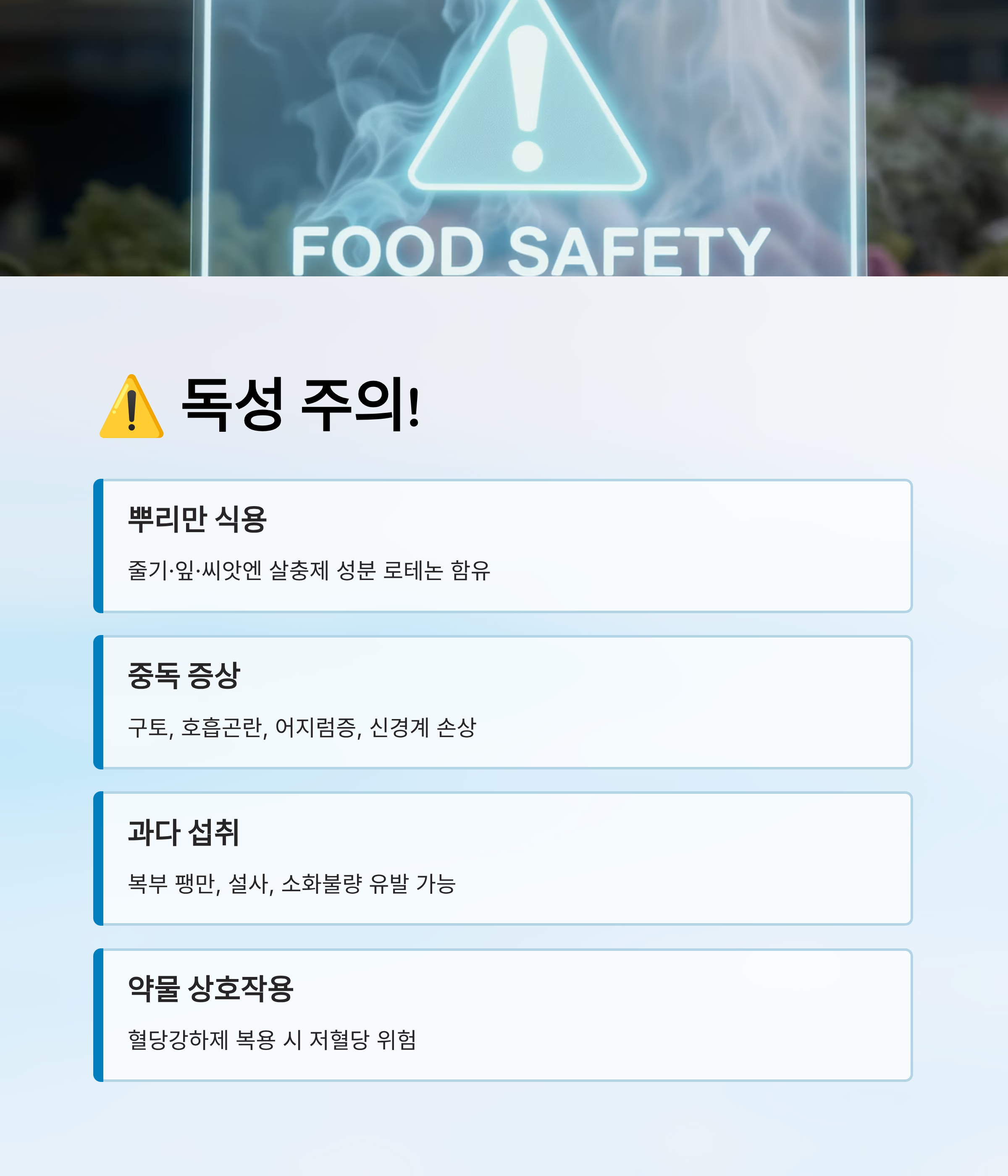 | 뿌리만 식용 가능 | 잎, 줄기, 씨앗에는 독성 로테논 존재 | 뿌리 껍질 벗겨 섭취 |