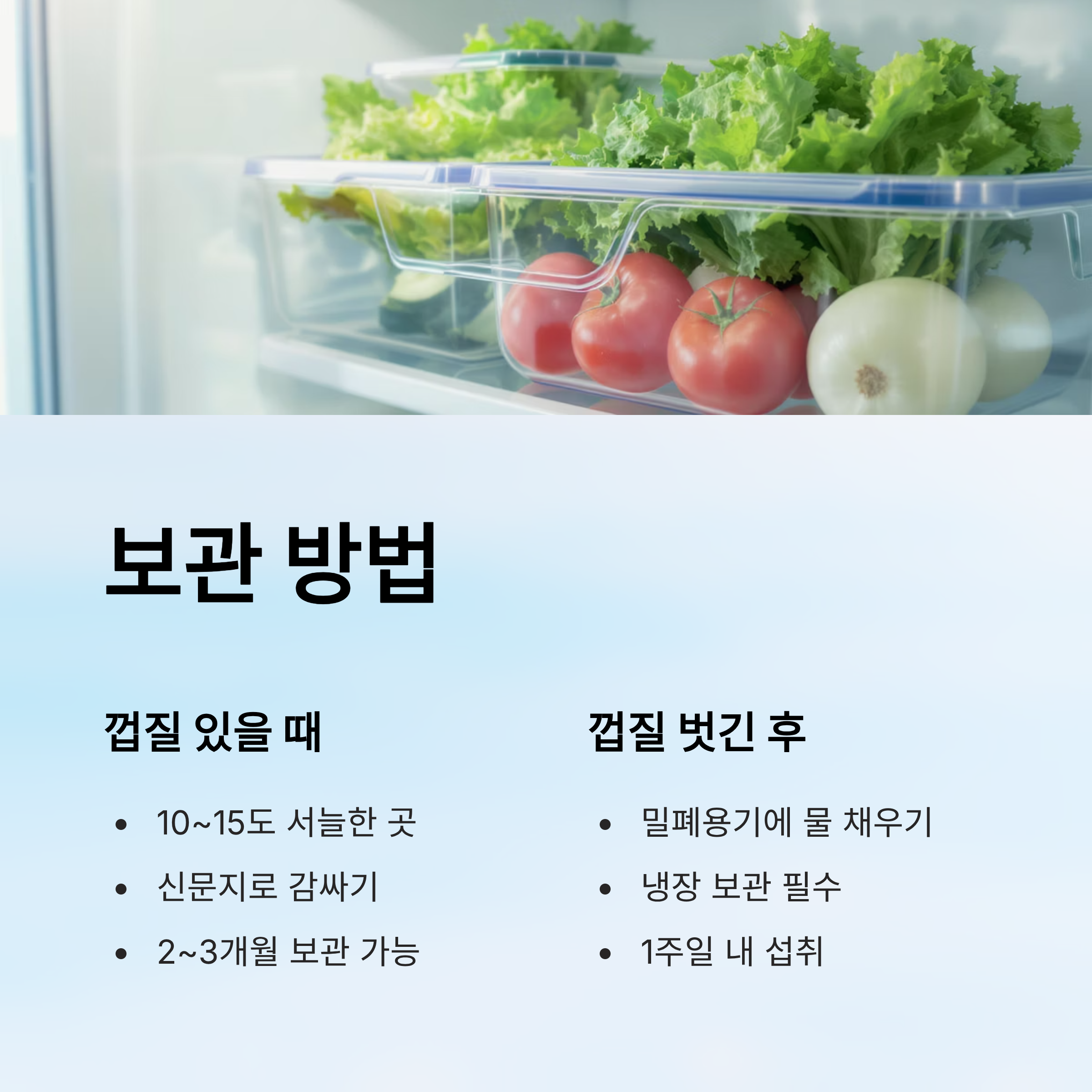 | 껍질 그대로 | 10~15℃, 서늘하고 통풍 잘 되는 곳 | 2~3개월 |