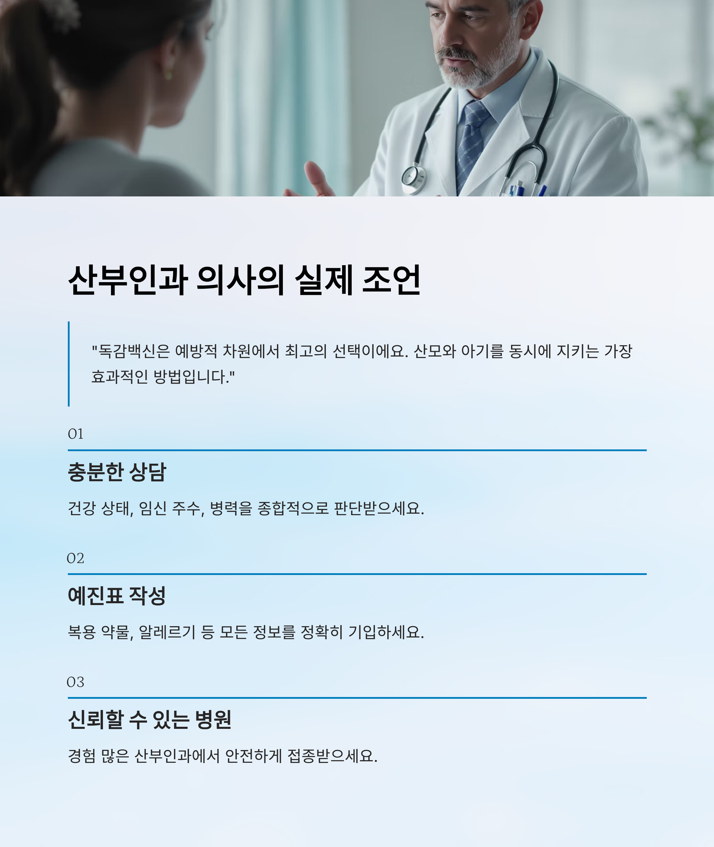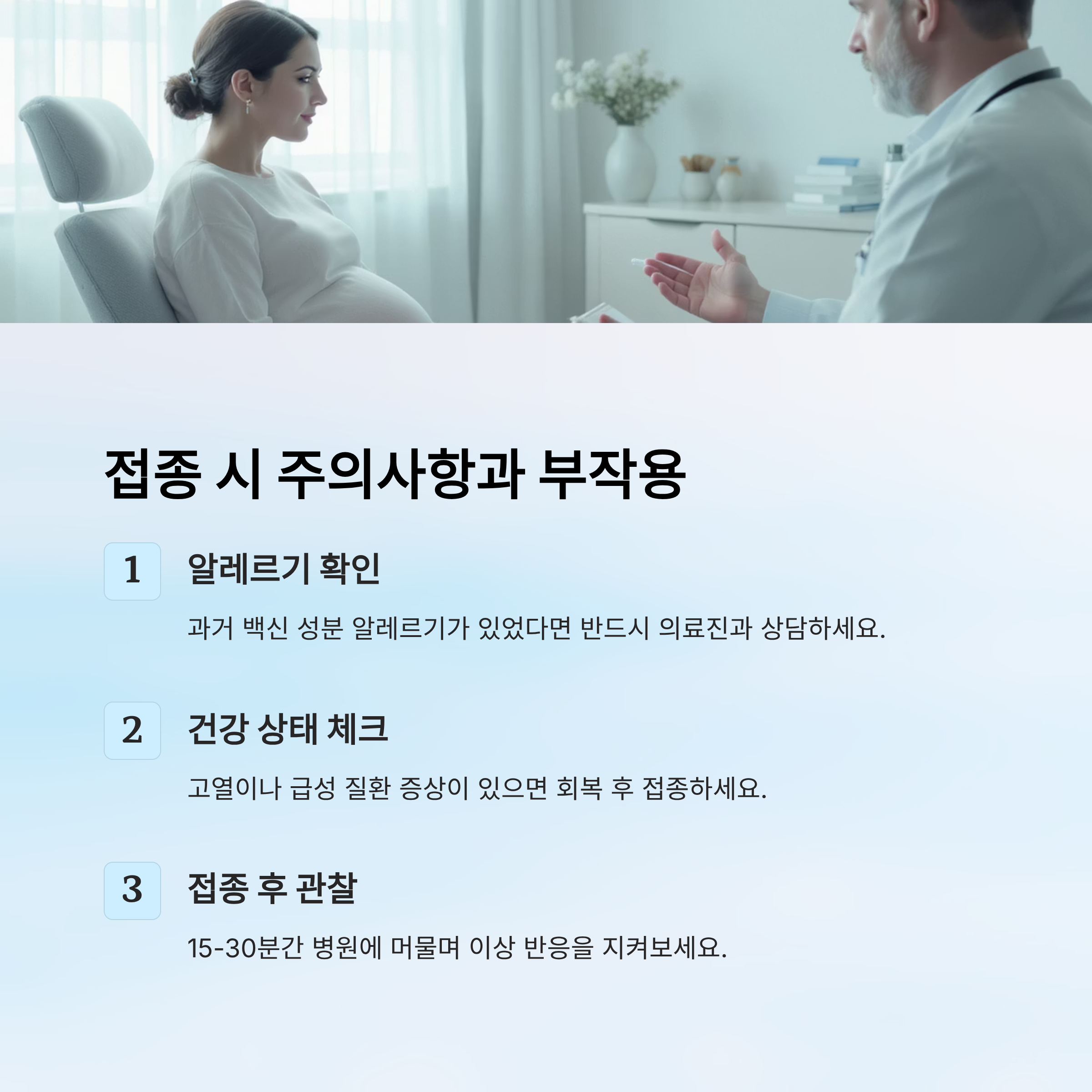 임산부에게 접종 전 가장 중요한 건 ‘의사와의 충분한 상담’이에요. 단순히 인터넷 정보에 의존하기보다는, 나의 건강 상태, 임신 주수, 병력 등을 종합적으로 판단해줄 수 있는 전문가의 조언을 듣는 것이 안전해요. 믿을 수 있는 병원을 선택하는 것도 중요하고요.