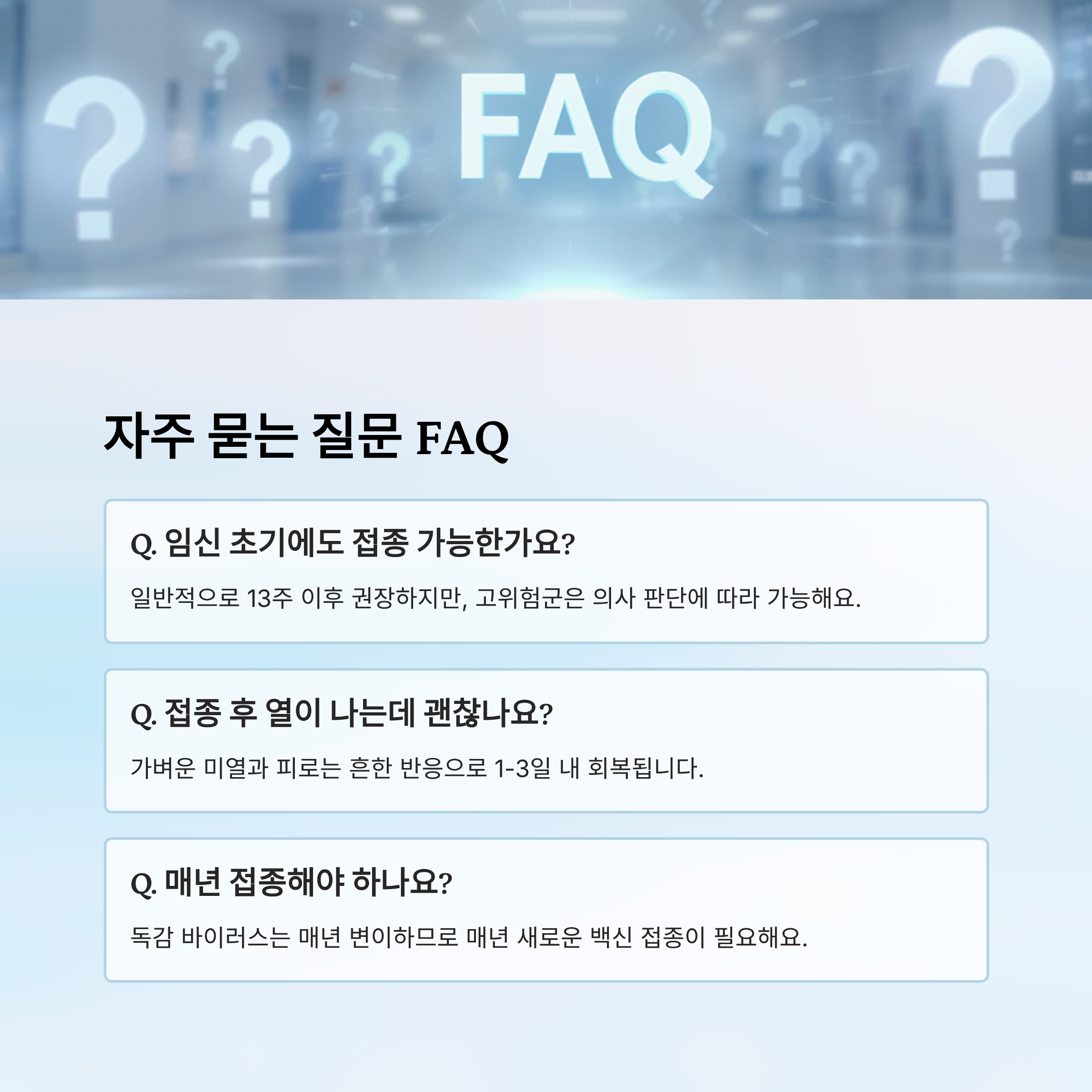 A1. 네, 세계보건기구(WHO)와 질병관리청(KDCA) 모두 임산부를 독감 예방접종의 최우선 대상자로 지정하고 있어요. 산모와 태아를 동시에 보호하는 효과가 있기 때문이에요.