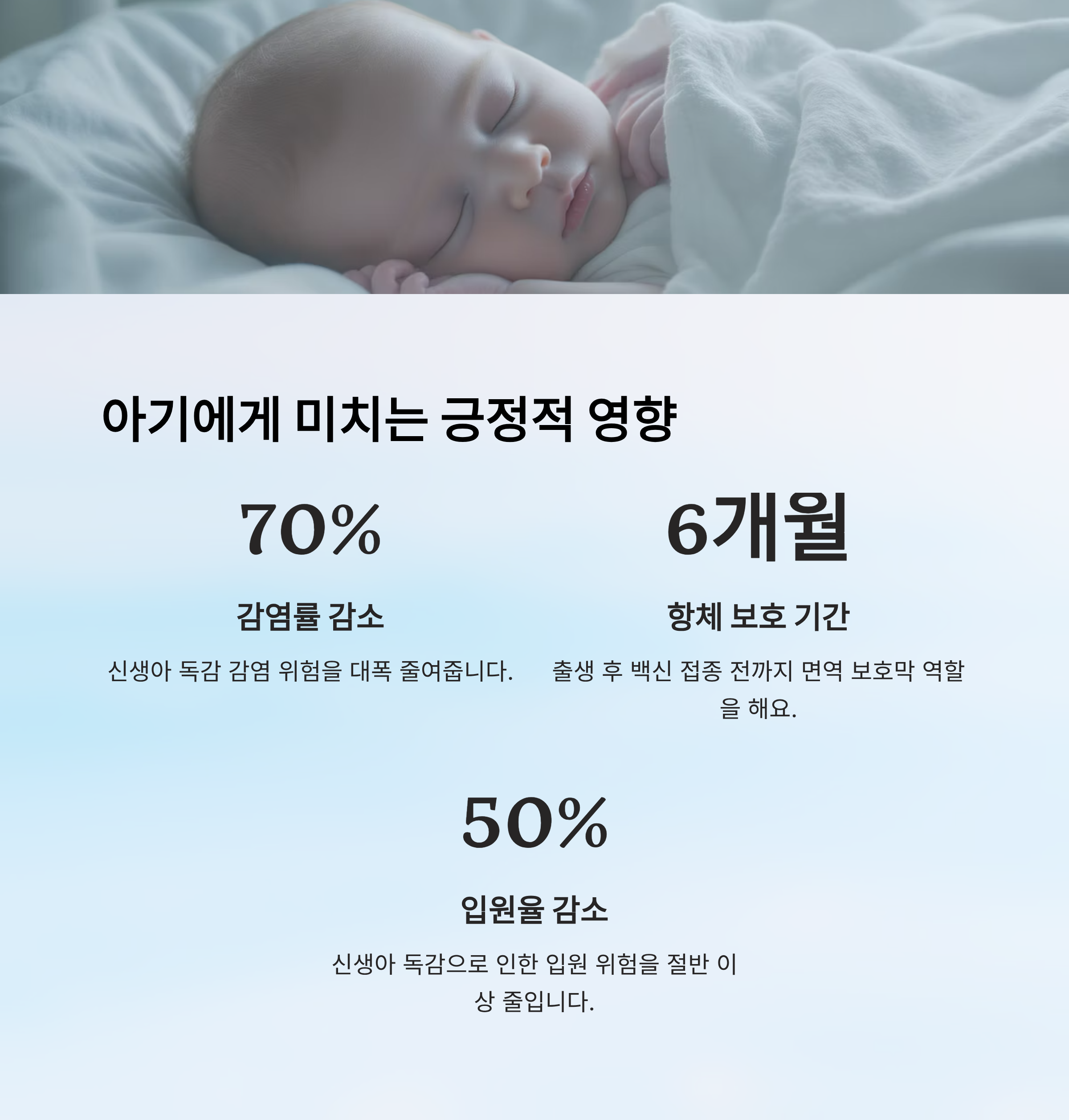 신생아는 생후 6개월이 되기 전까지는 독감 백신을 맞을 수 없어요. 면역력이 매우 약한 이 시기에 독감에 걸리면 고열과 폐렴, 심하면 입원이 필요할 정도로 위험할 수 있어요. 그래서 엄마가 임신 중에 백신을 맞아주는 게 아기를 위한 최고의 예방 방법이 되는 거죠.