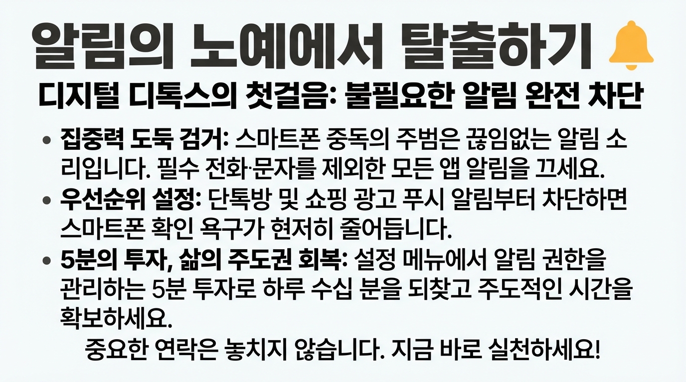 스마트폰 중독의 가장 큰 원인은 끊임없이 울리는 '알림'입니다. 메신저, SNS, 광고 앱 알림이 울릴 때마다 우리의 집중력은 조각나게 되죠. 꼭 필요한 전화나 메시지를 제외한 모든 앱의 알림을 꺼보세요.