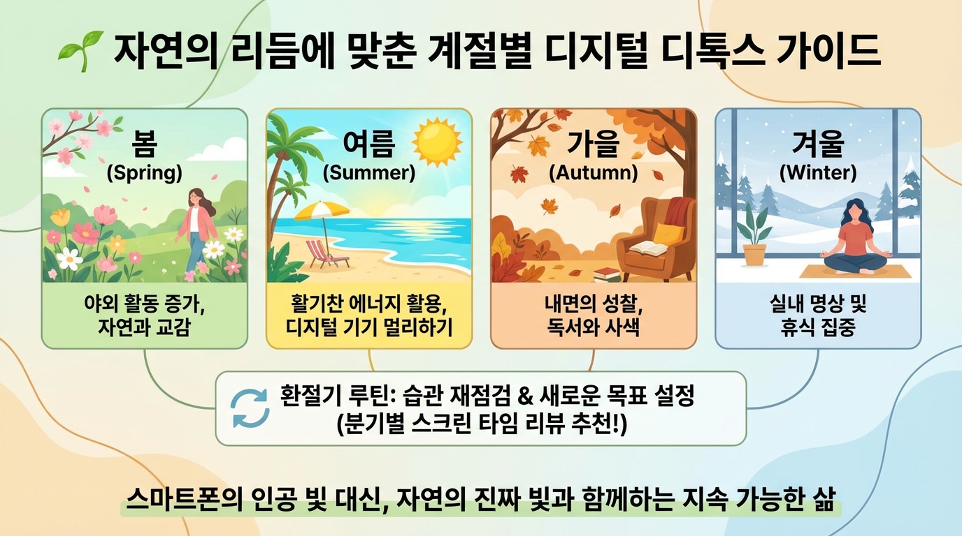 디지털 디톡스도 계절의 흐름에 맞춰 실천하면 더 효과적입니다. 예를 들어 봄에는 야외 활동을 늘리고, 겨울에는 실내에서 명상이나 독서에 집중하는 식이죠.