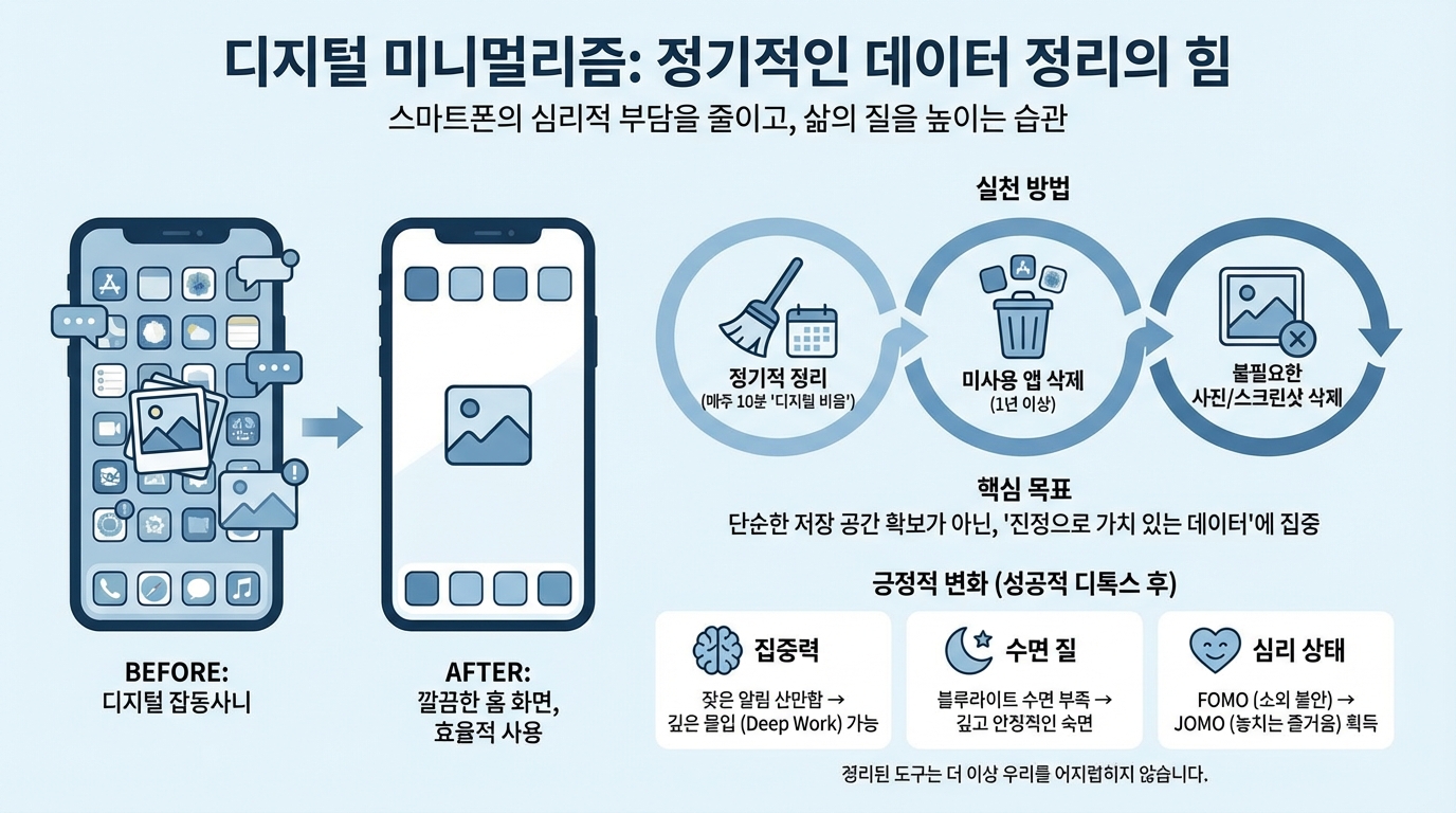 디지털 미니멀리즘은 단순히 저장 공간을 확보하는 것이 아니라, 내가 진정으로 가치를 두는 데이터에만 집중하겠다는 선언입니다.