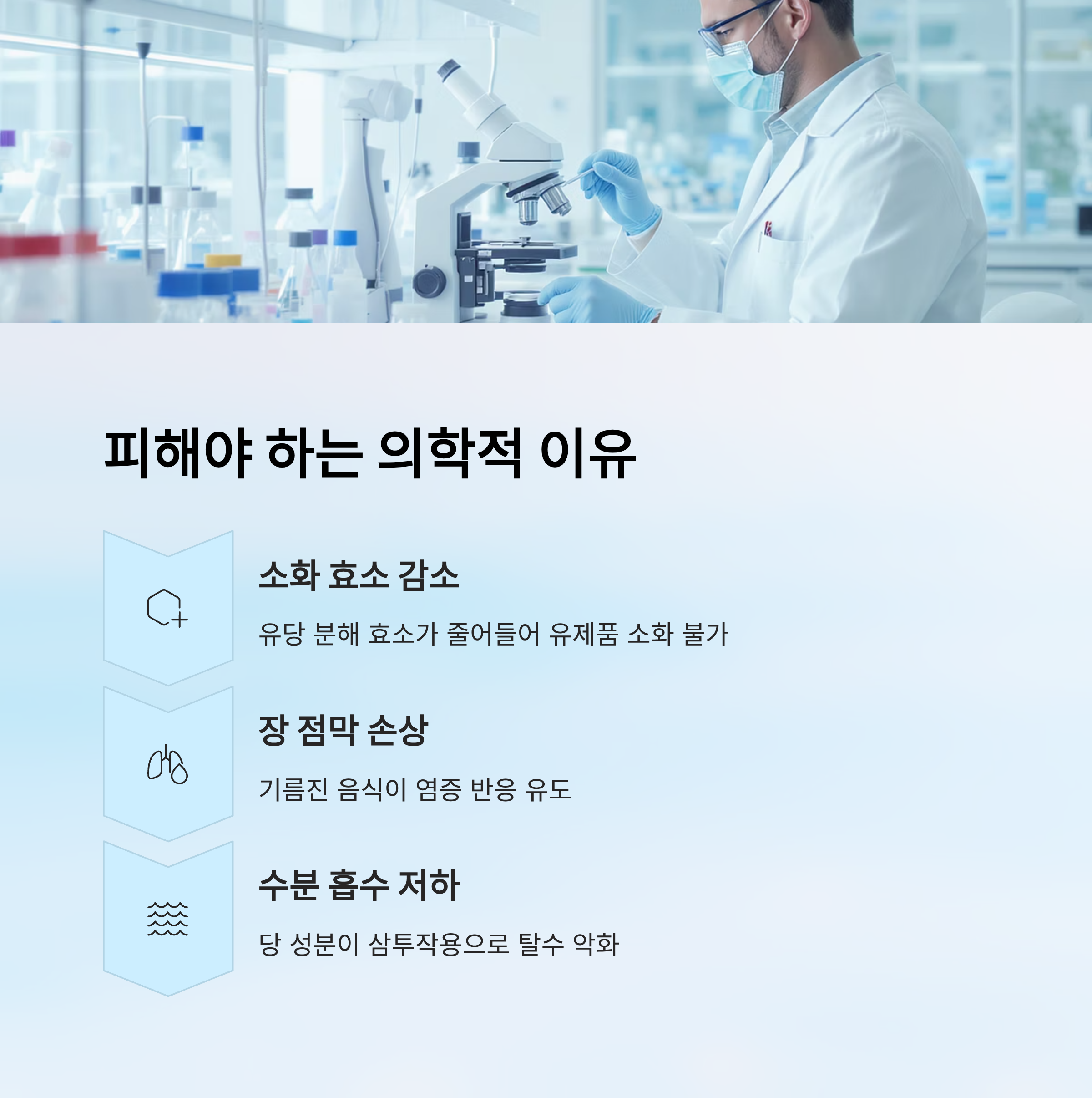| 유제품 | 유당 분해 부족 → 설사 유발 | 회복 후 소량부터 시도 |