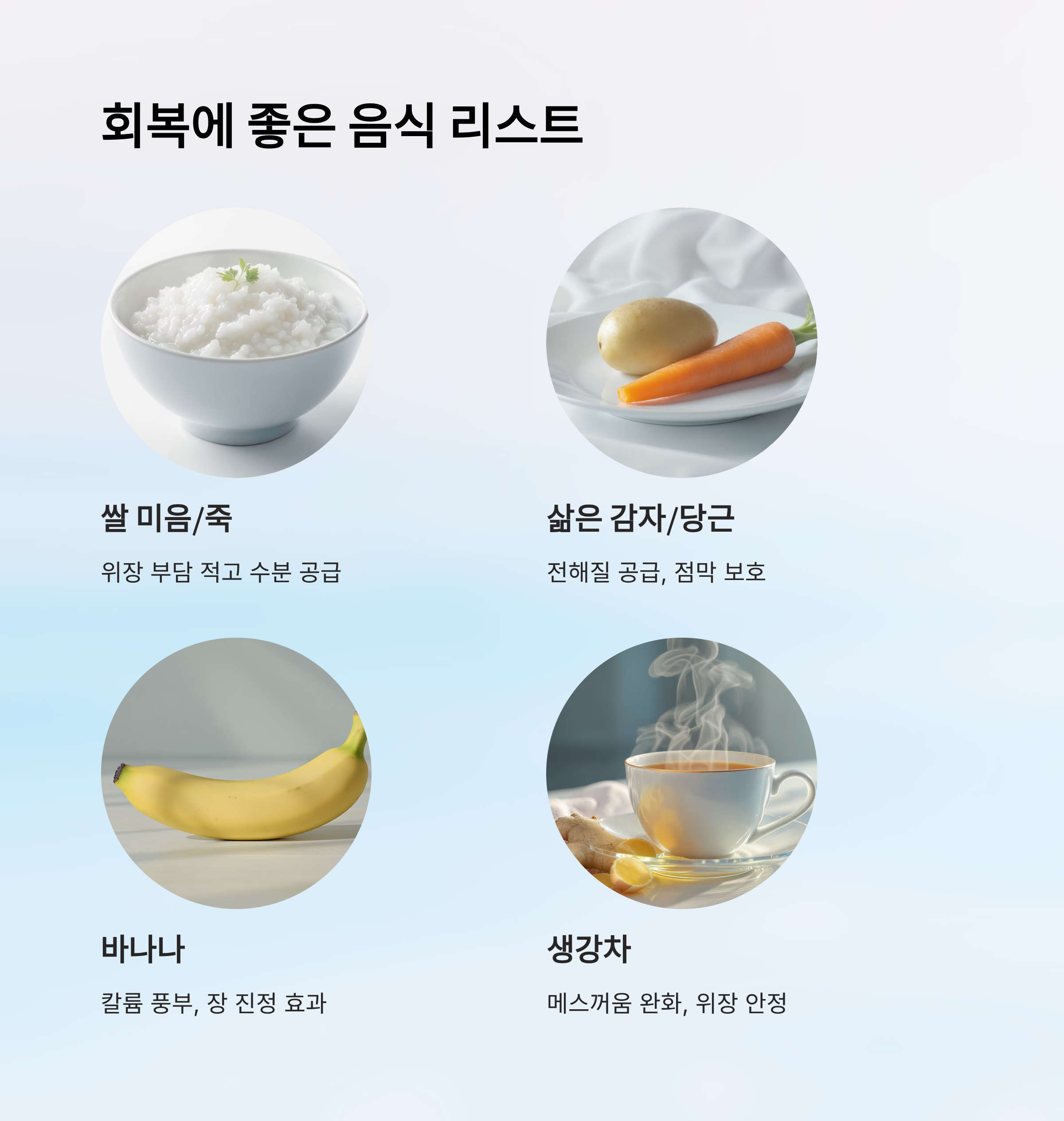 1️⃣ **쌀 미음/죽**: 가장 기본이 되는 회복 음식이에요. 위장 부담이 적고, 수분을 함께 공급해줘요. 처음에는 묽은 미음부터 시작하고, 점차 진하게 끓인 죽으로 넘어가는 게 좋아요.
