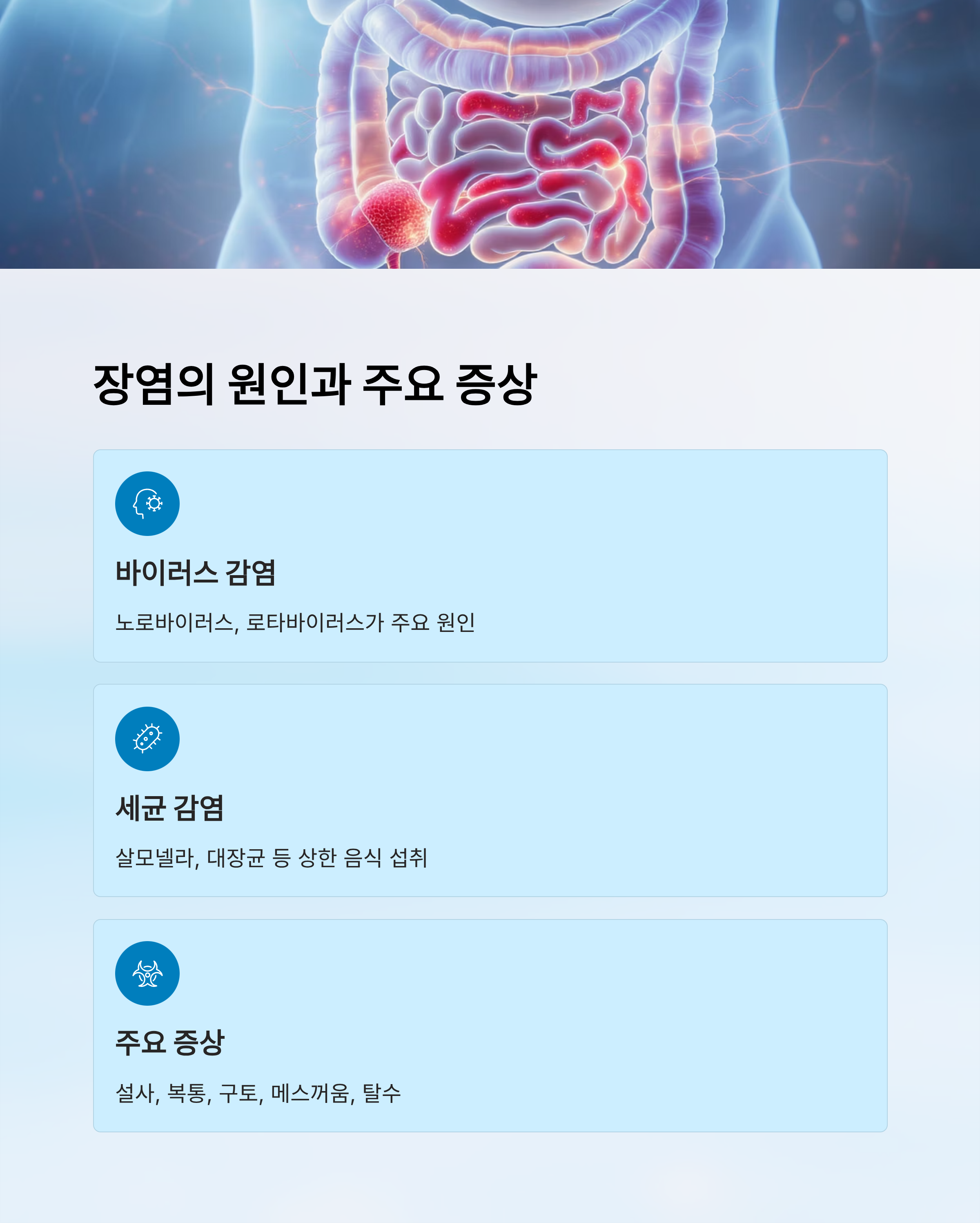 장염은 소장이나 대장에 염증이 생긴 상태를 말해요. 보통 세균이나 바이러스에 감염되거나, 상한 음식을 먹었을 때 잘 생기죠. 이 외에도 음식 알레르기, 스트레스, 항생제 남용도 원인이 될 수 있어요.