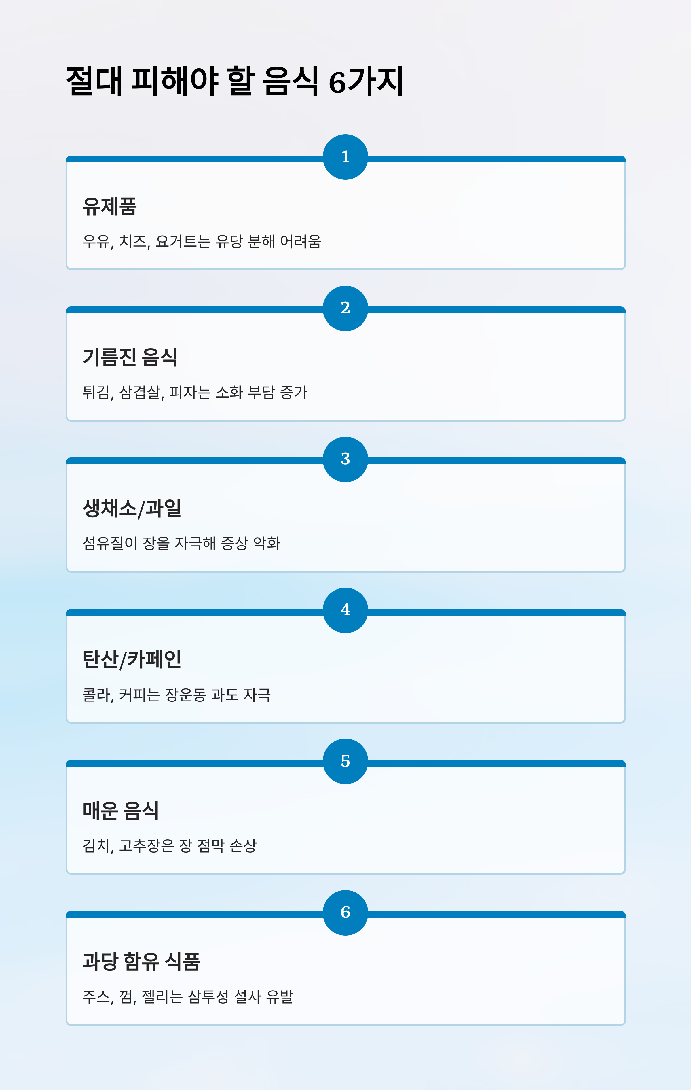 1️⃣ **유제품** (우유, 치즈, 요거트): 유당 분해 효소가 장염 중에 줄어들기 때문에 소화가 힘들어져요. 속이 더 불편해지고 설사를 유발할 수 있어요.