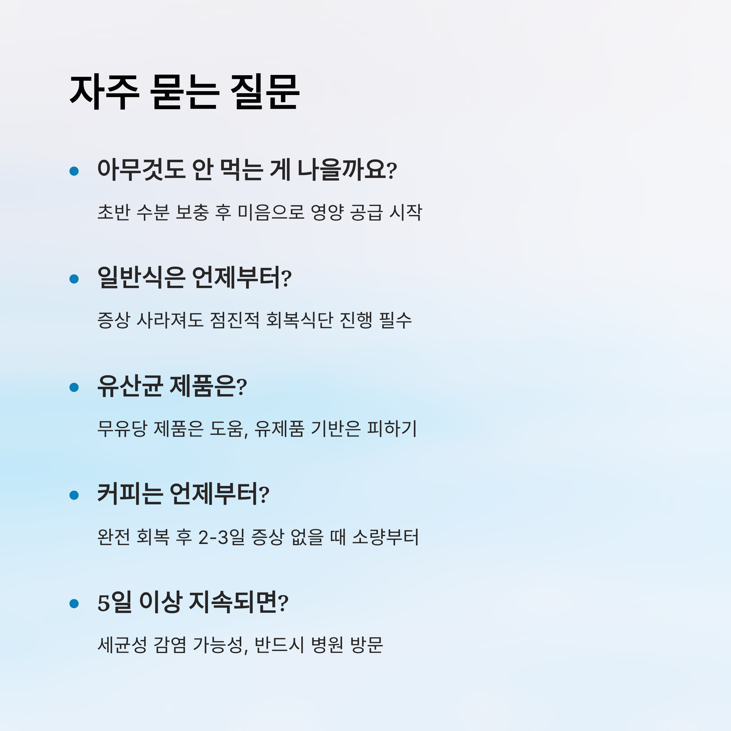 A1. 초반엔 수분 보충이 우선이지만, 장이 조금 안정되면 영양 공급도 중요해요. 미음이나 부드러운 죽으로 천천히 시작하는 게 좋아요.