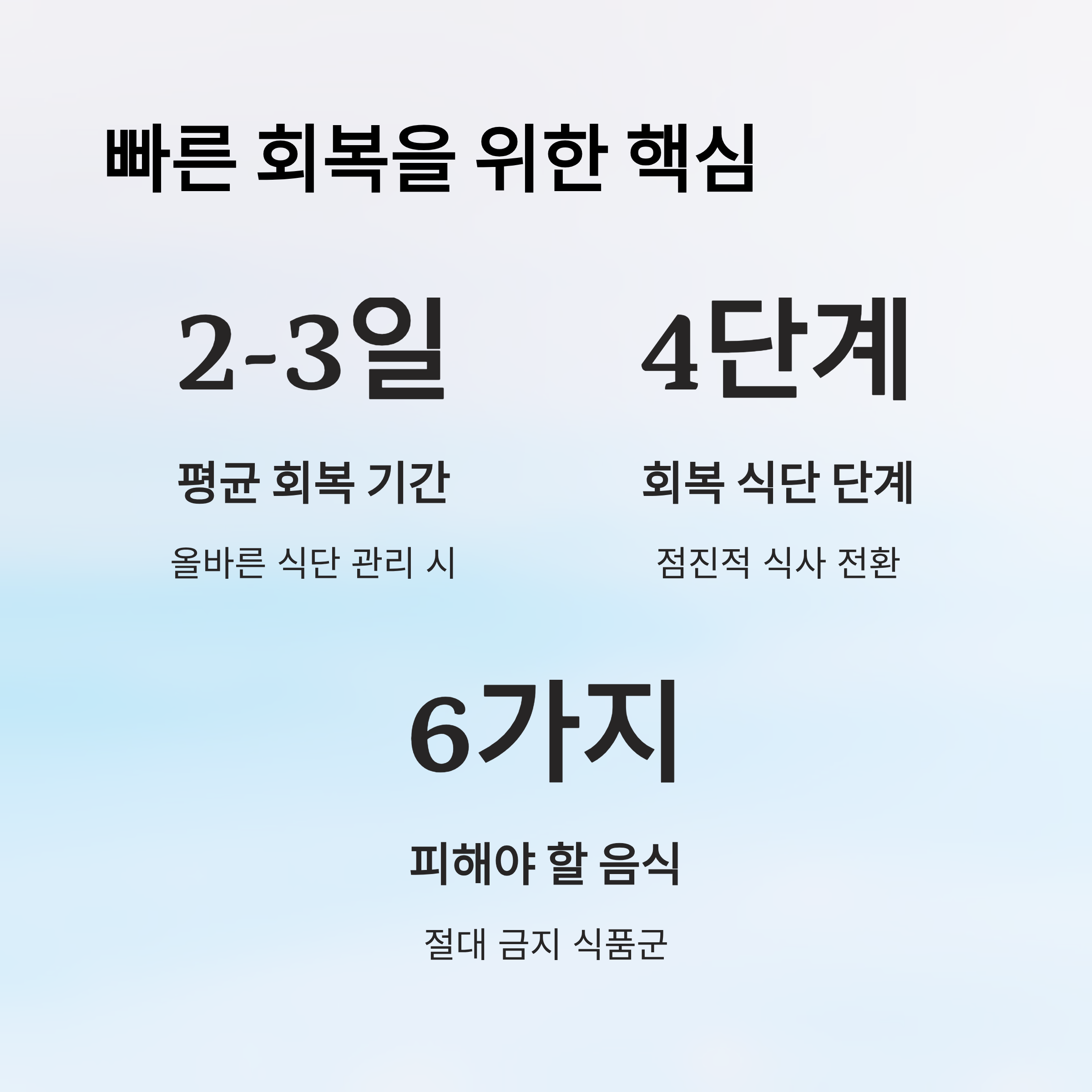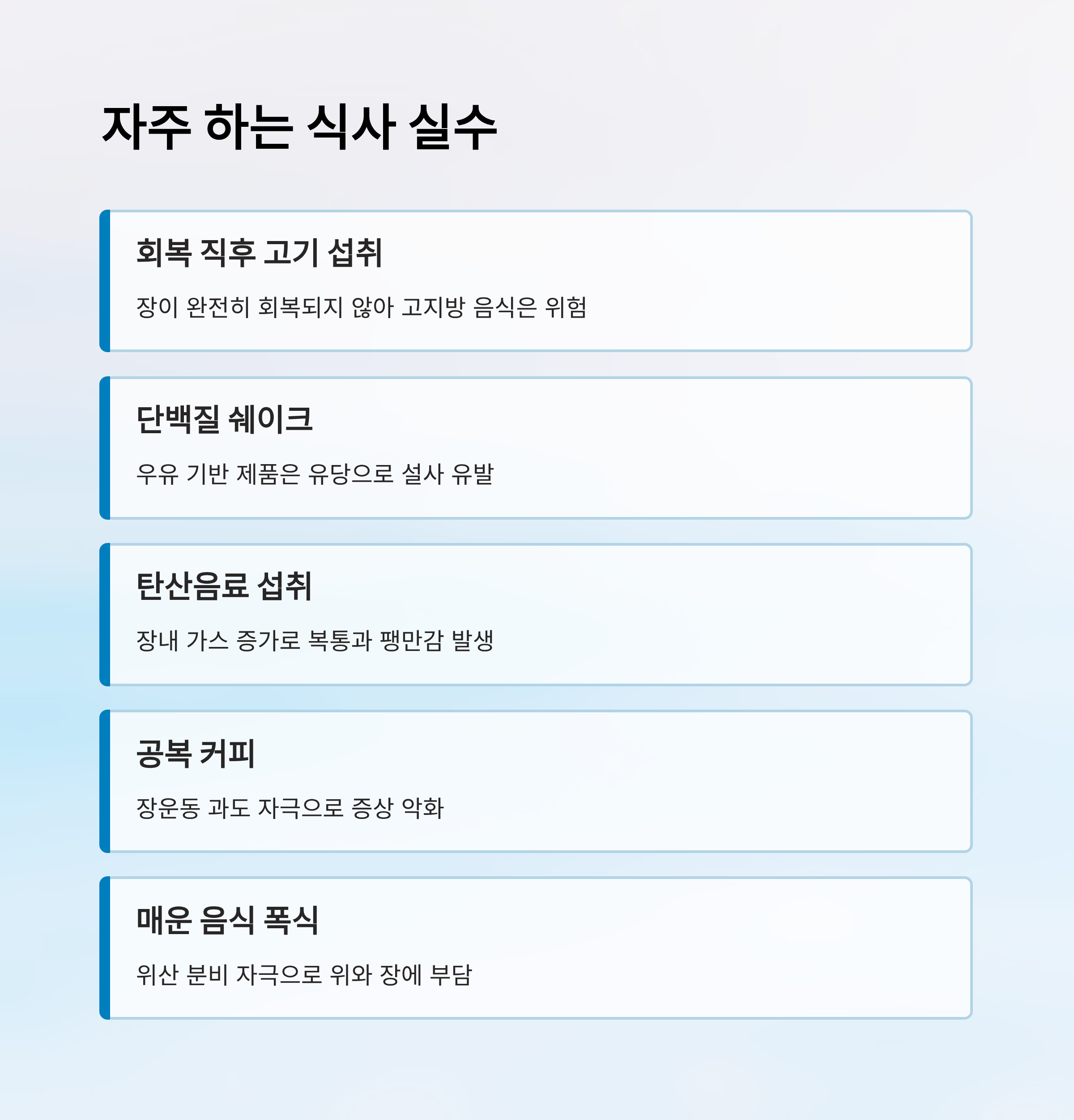 | 기름진 음식 바로 섭취 | 장 점막 재손상 | 회복 후 3~5일 뒤 시도 |